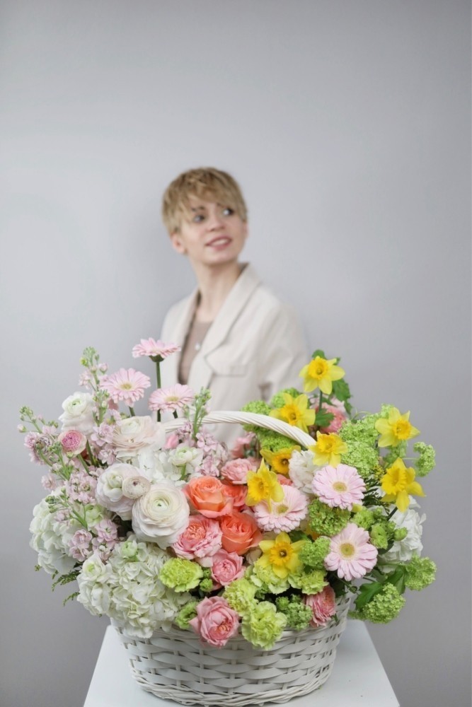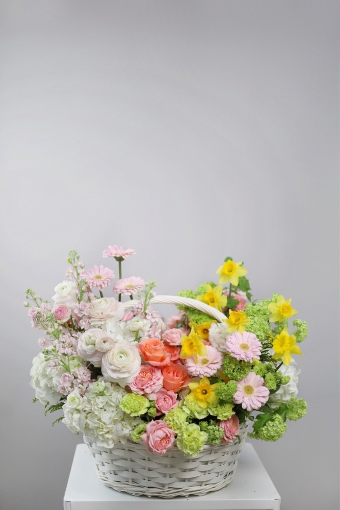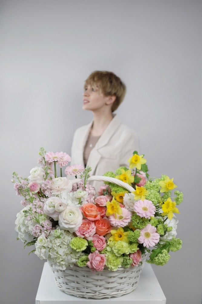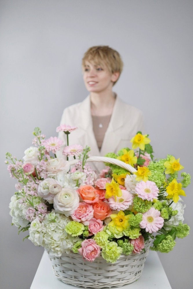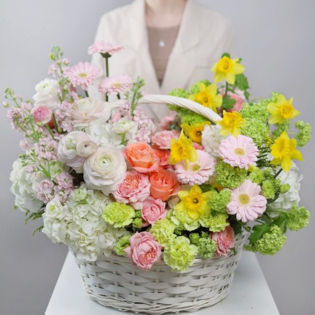В корзине присутствуют сезонные цветы: ранункулусы, нарциссы, вибурнум.