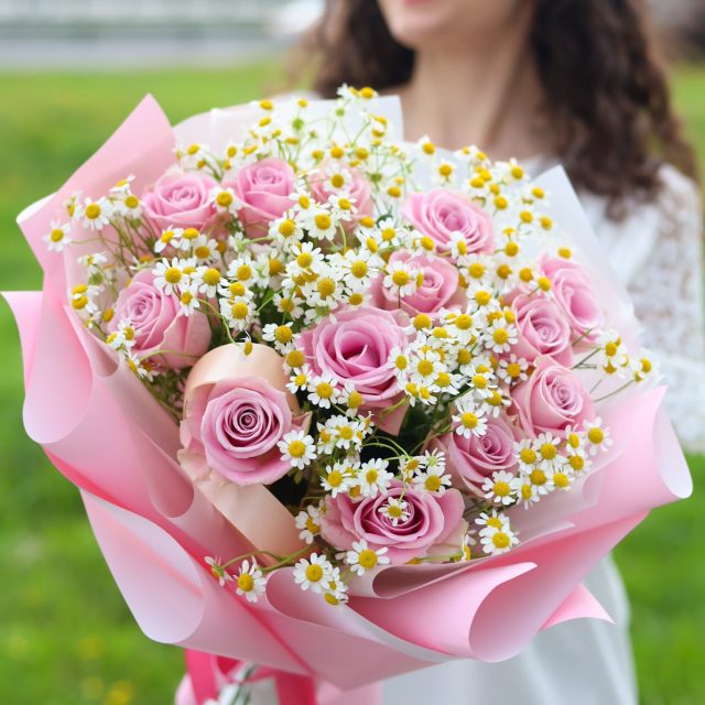 Прекрасный объемный букет из 13-ти одноголовых роз и 15 ароматных ромашек в стильном оформлении.