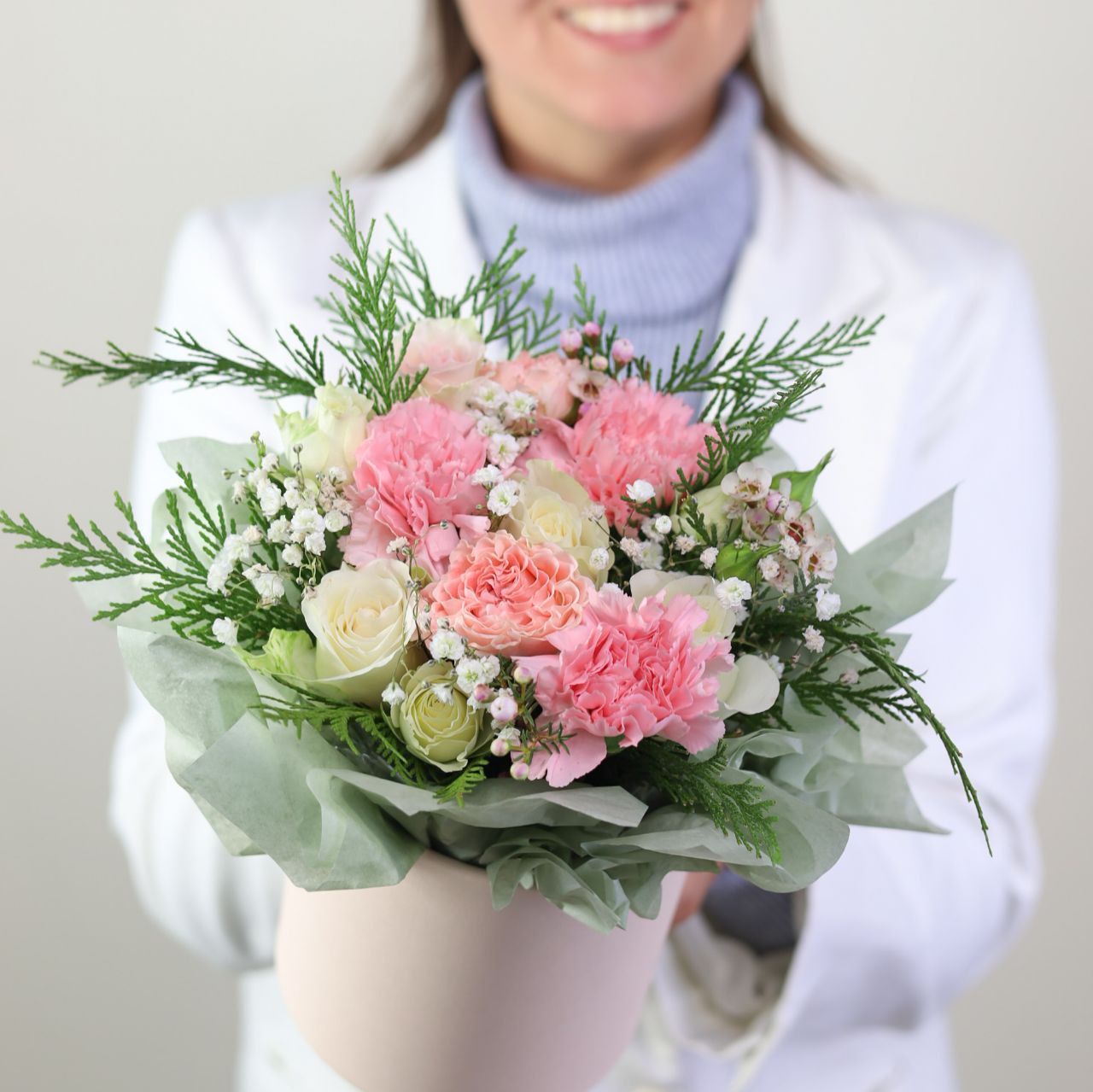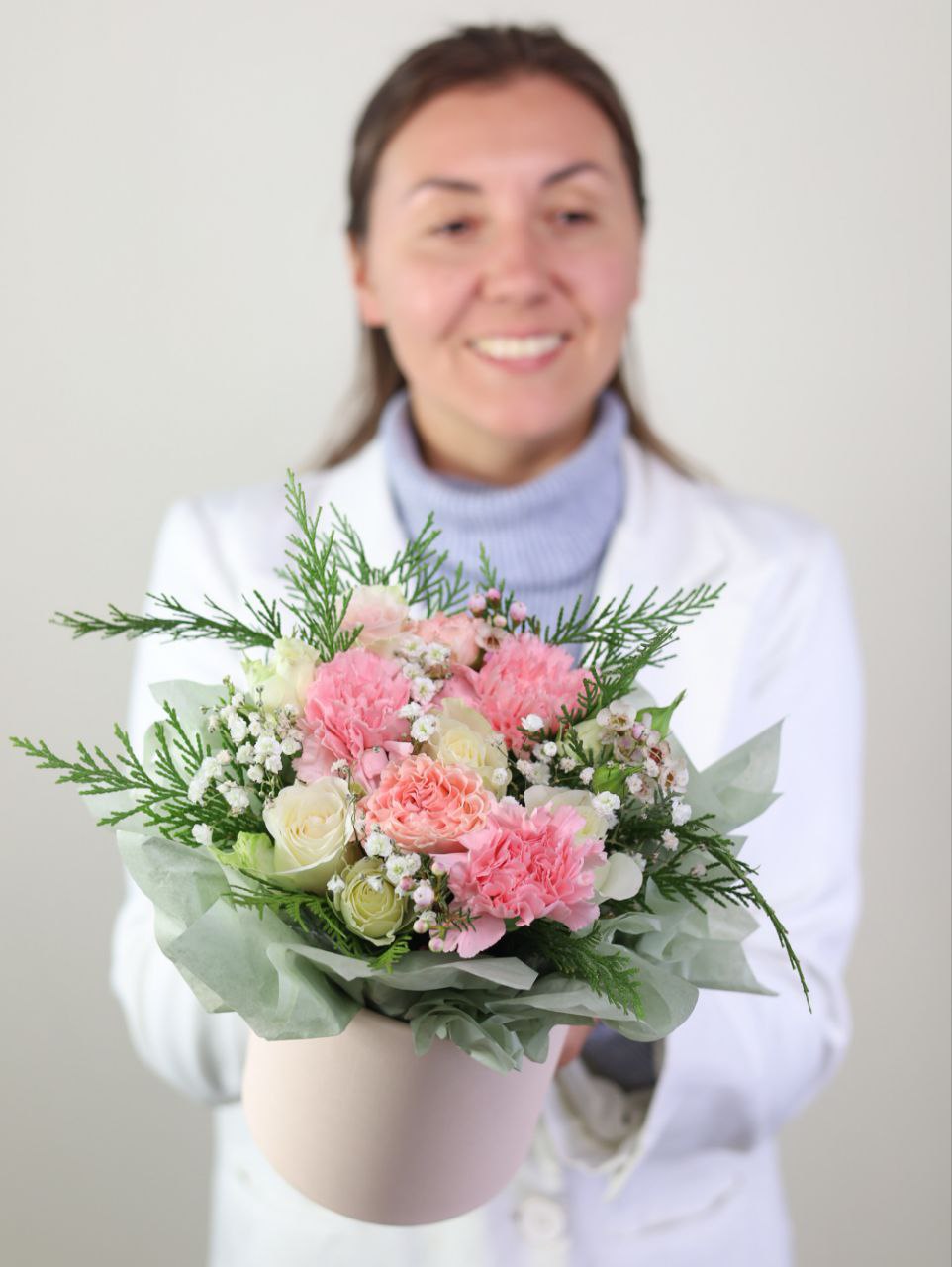 Композиция роз, диантусов, гипсофилы и ели в шляпной коробке.