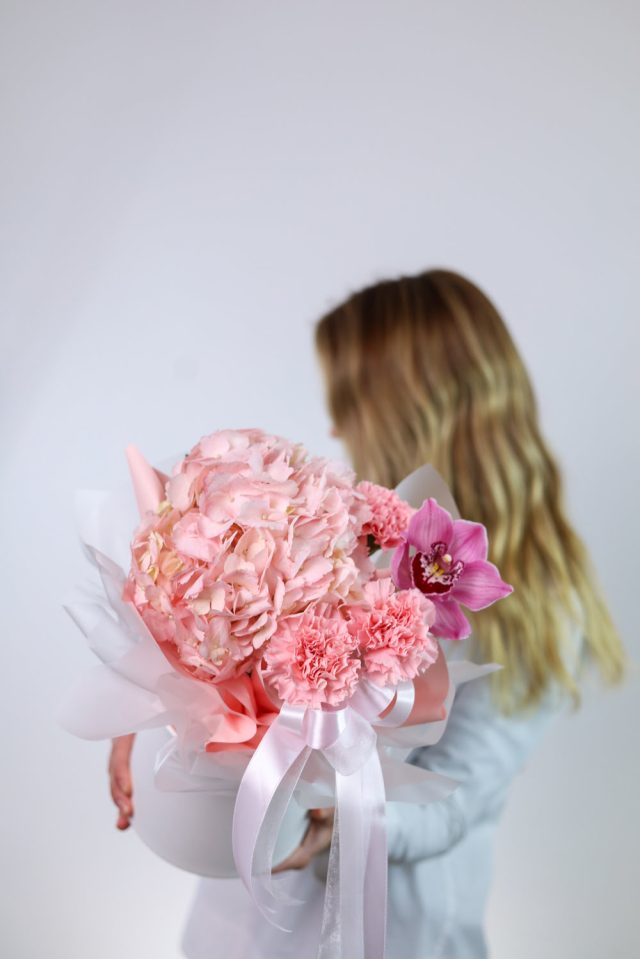 Состав: пышная гортензия, стойкие диантусы, орхидея. Высота около 30 см.