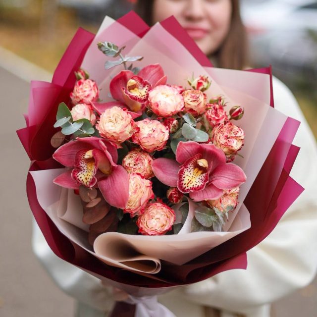 Красивый букет со стойкими орхидеями, кустовыми пионовидными розами и эвкалиптом.