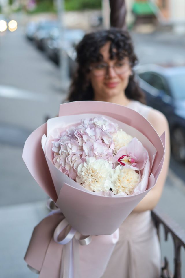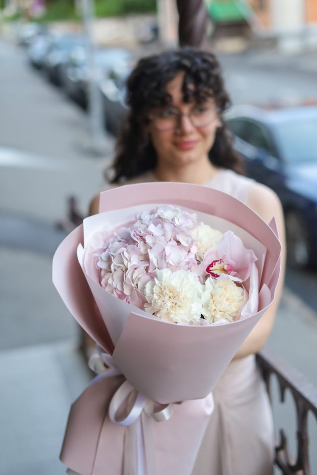 Состав: пышная гортензия, стойкие диантусы и орхидея.