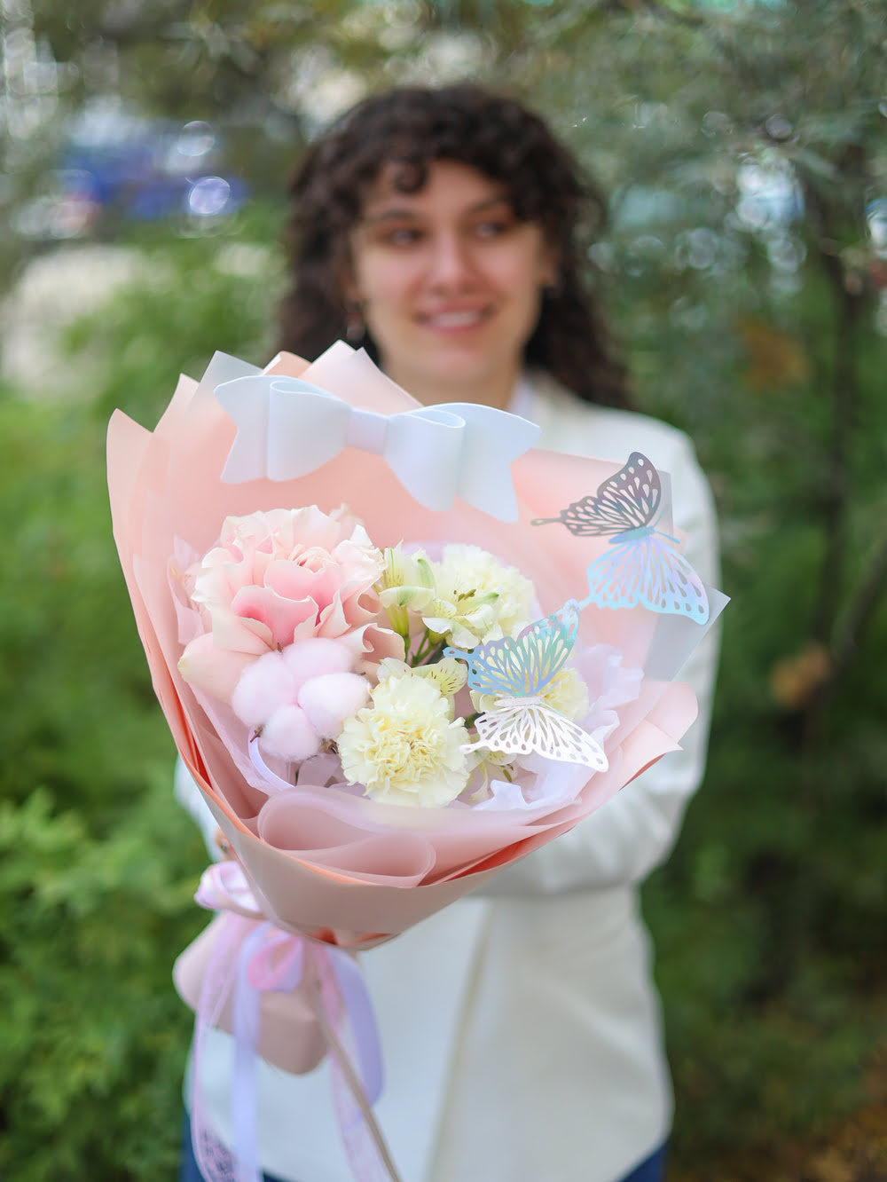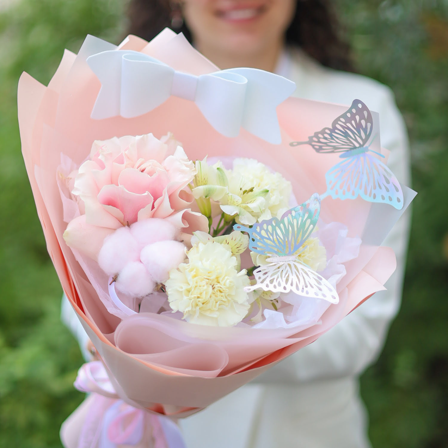 Состав: французская роза, стойкие диантусы и альстромерия, хлопок, декор в виде бабочек и бантика.