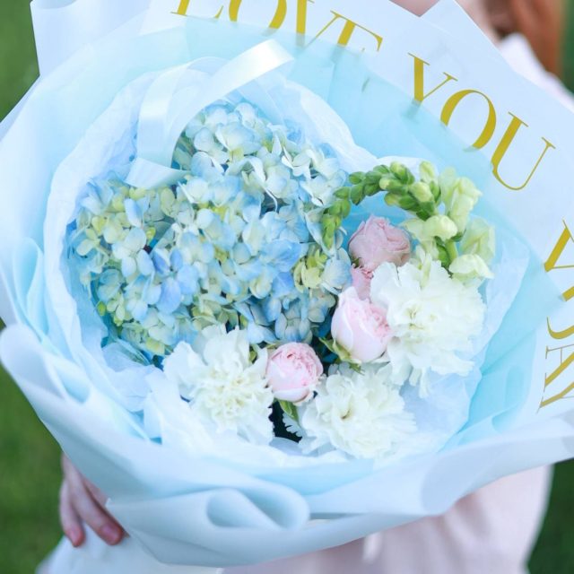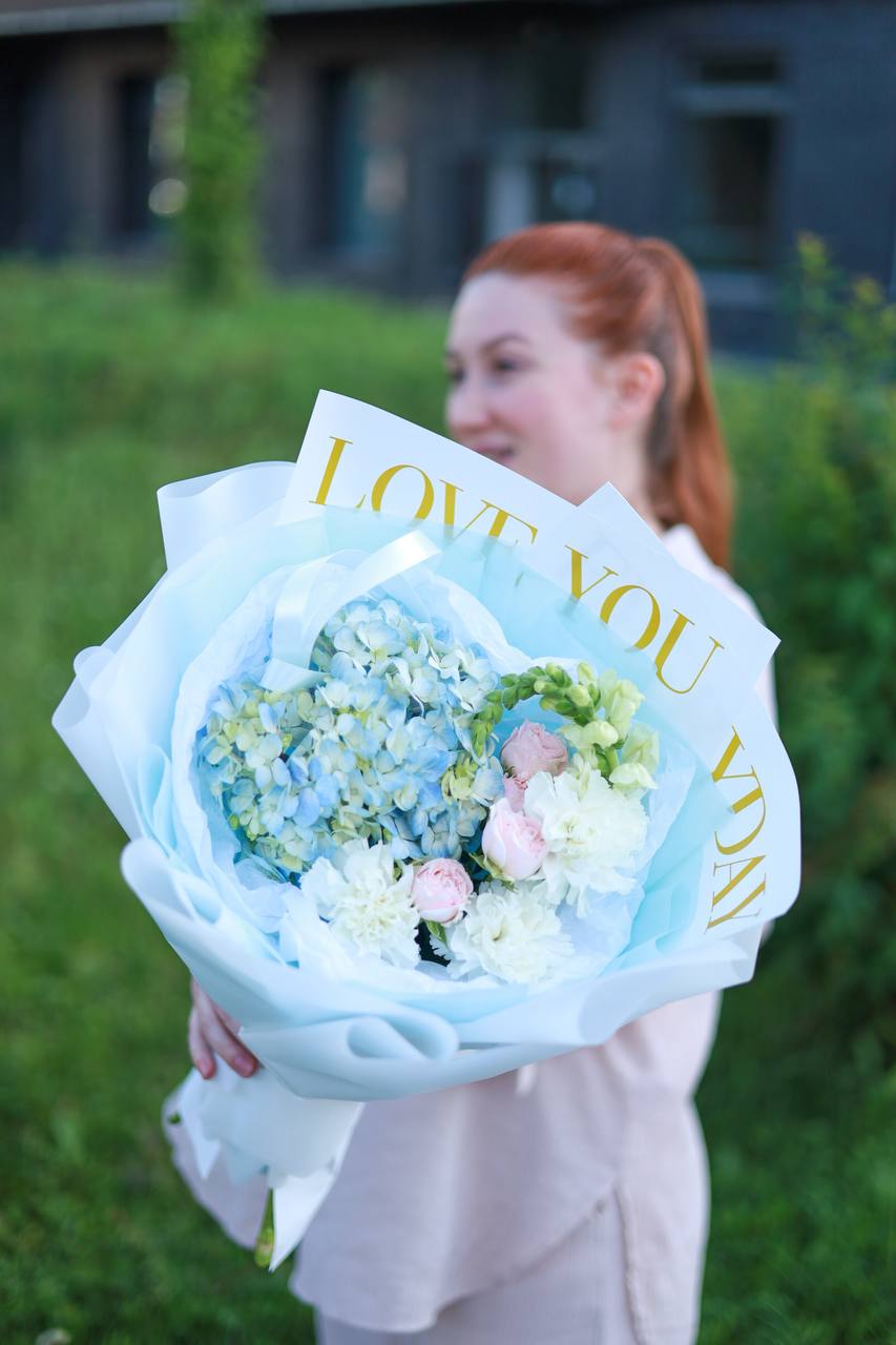 Букет пышной гортензии, кустовых роз, леувенбека и стойких диантусов в оформлении.