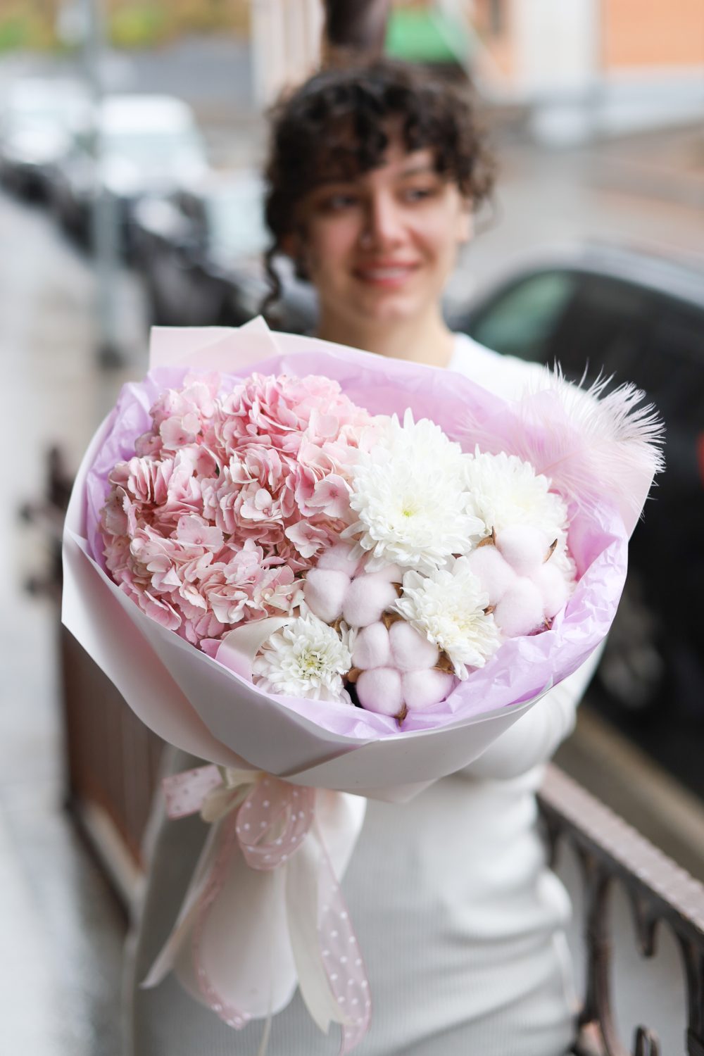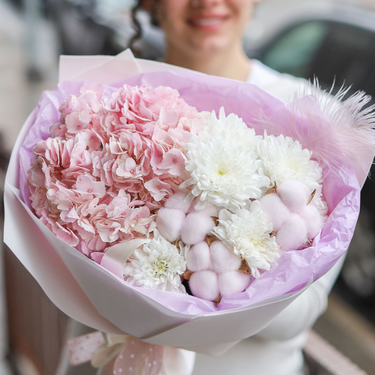 Обьемный и нежный букет с гортензией, стойкой хризантемой и хлопком.