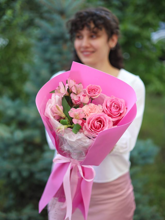 Состав: кустовые и одноголовые розы, стойкая альстромерия, диантус.
