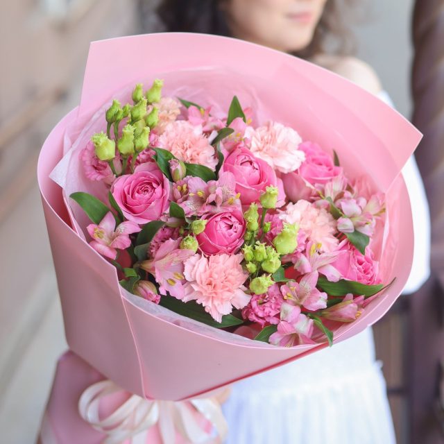 Прекрасный сборный букет в розовой гамме в стильном оформлении.
