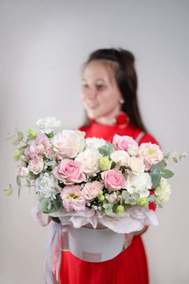 Очаровательная композиция в нежно-розовой гамме в шляпной коробке.