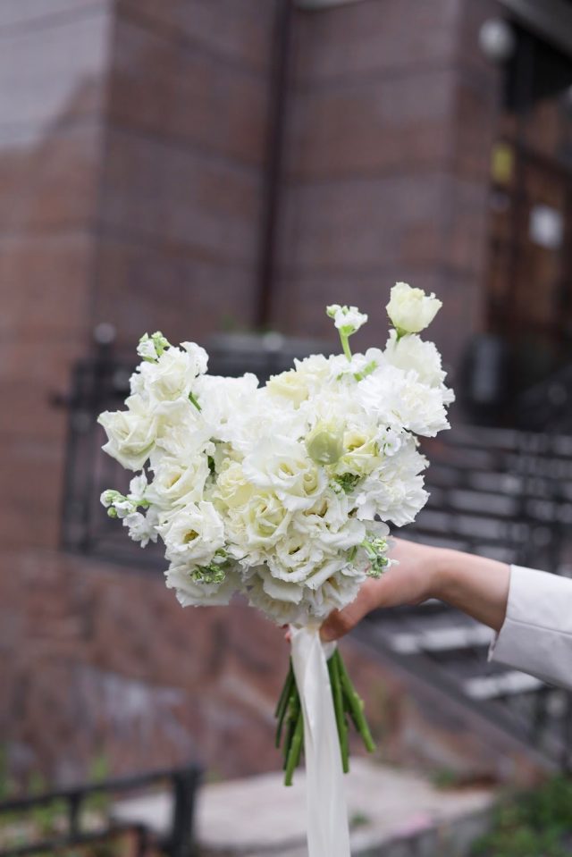 Прекрасный свадебный букет из нежной эустомы, диантусов и ароматной маттиолы.