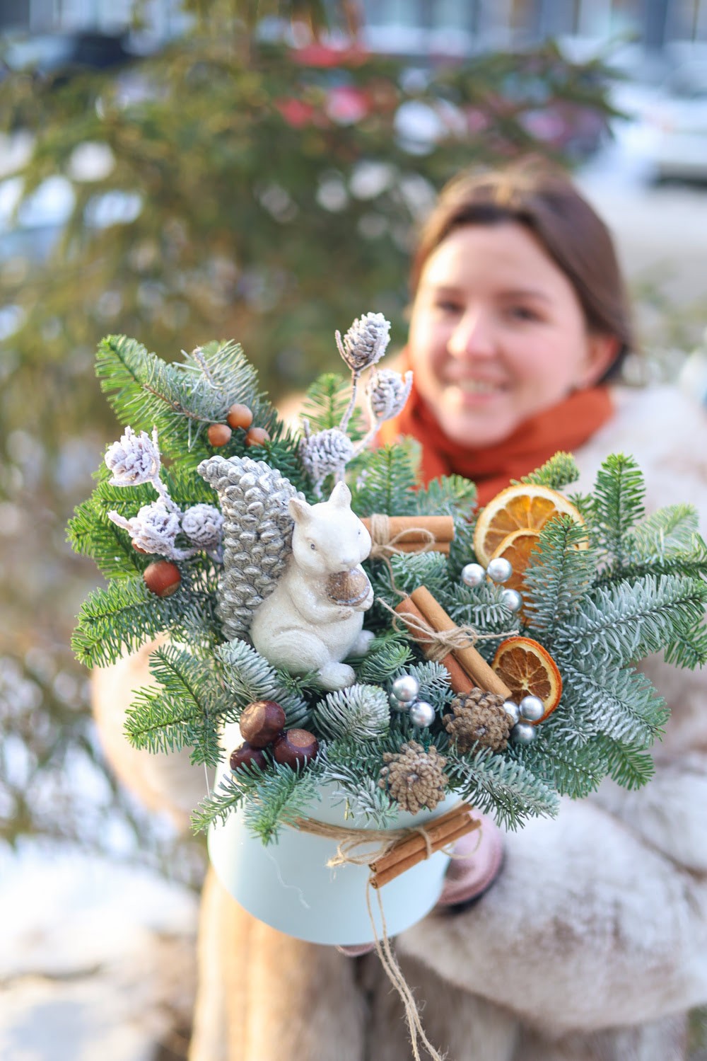 Состав: шишки и орешки, палочки корицы, елочные игрушки, апельсины, ель нобилис, фигурка белочки. Высота около 30-35 см.