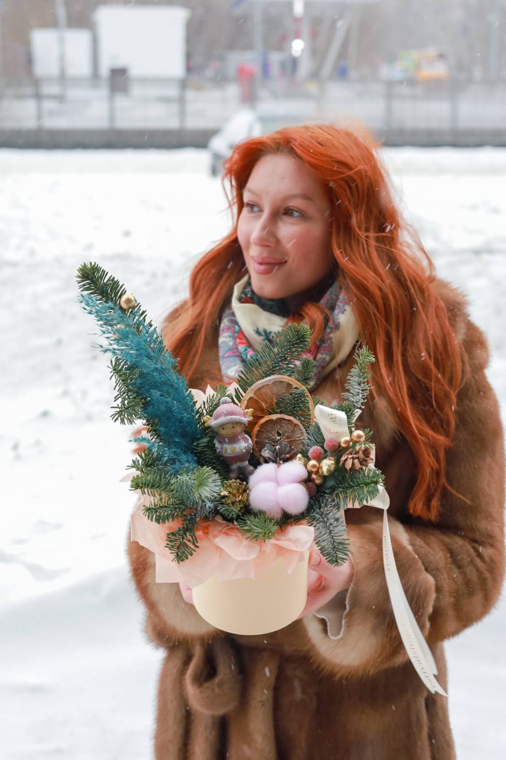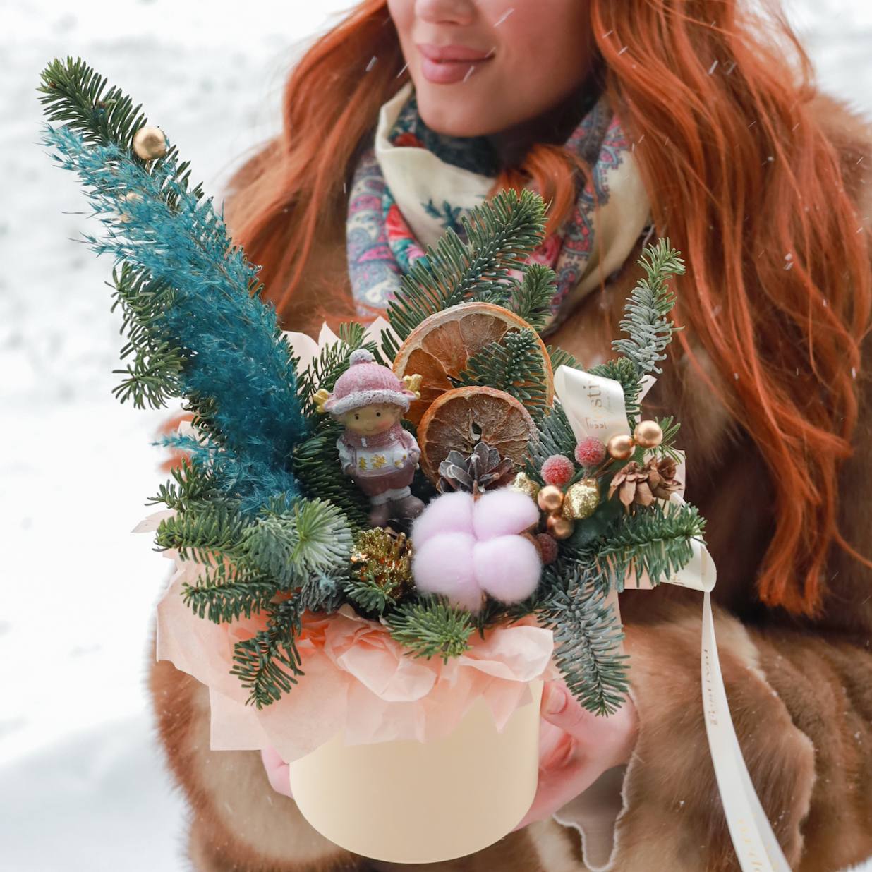 Аккуратная зимняя композиция с декором в шляпной коробке.