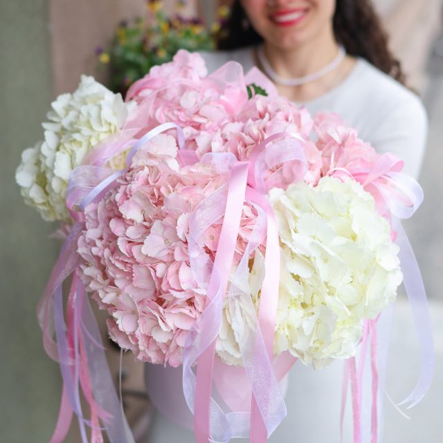 В композиции пять крупных гортензий белого и нежно-розового цвета.