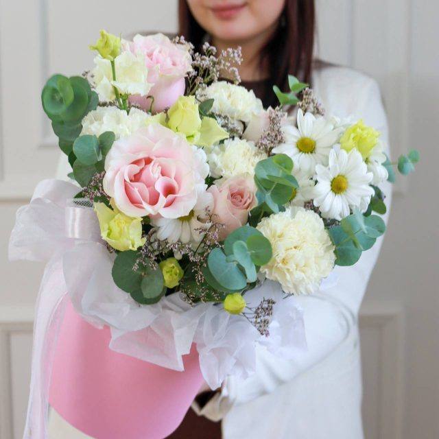 Композиция роз, ажурной эустомы, хризантемы, лимониума и душистого эвкалипта в шляпной коробке.