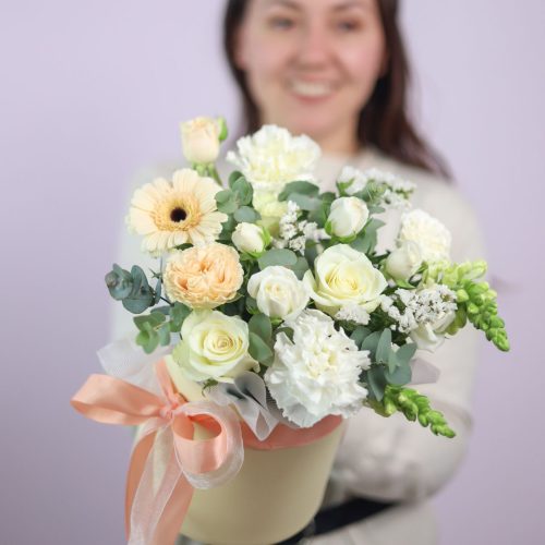 Состав: французские розы, ажурная эустома, одноголовые розы, душистый эвкалипт.