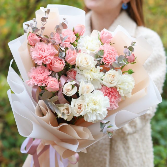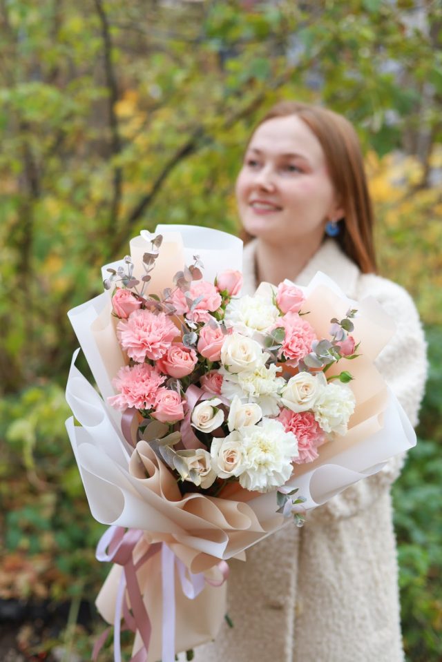 Прекрасный стильный букет с кустовыми пионовидными розами, стойкими диантусами и крашеным эвкалиптом.