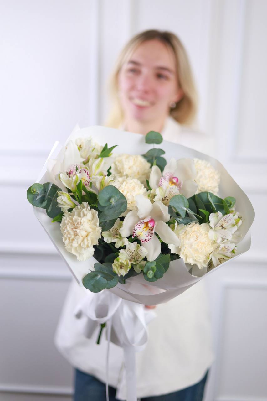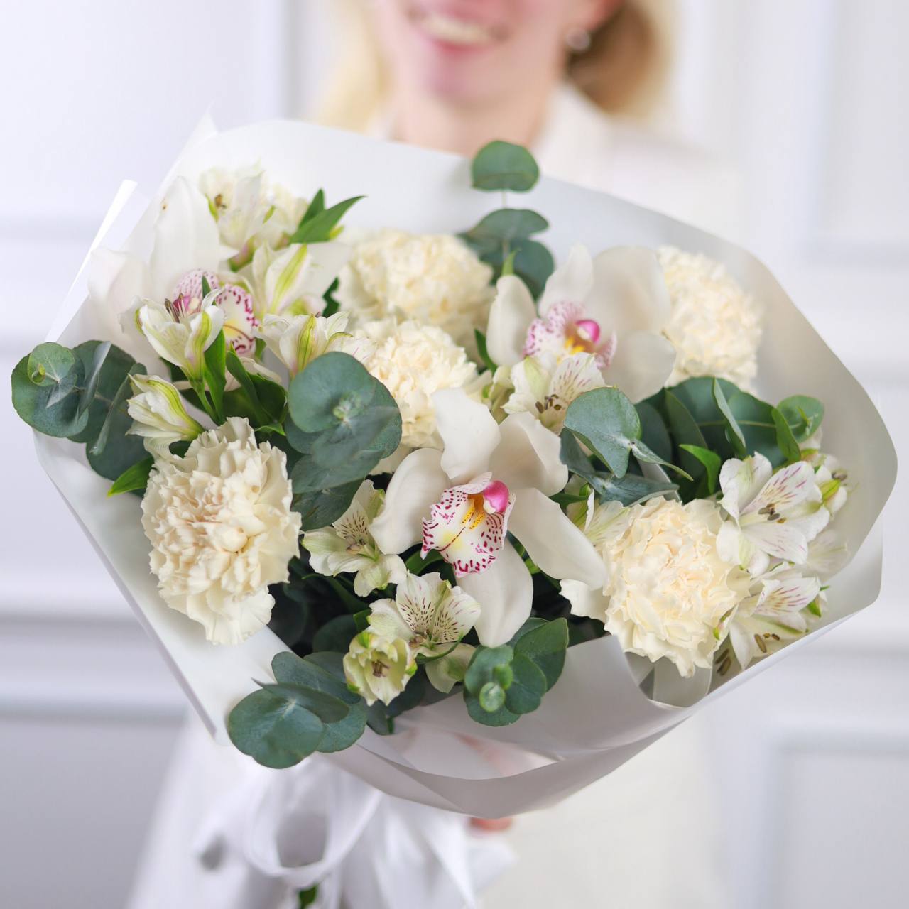 Букет стойких орхидей, диантусов, альстромерий и душистого эвкалипта в оформлении.