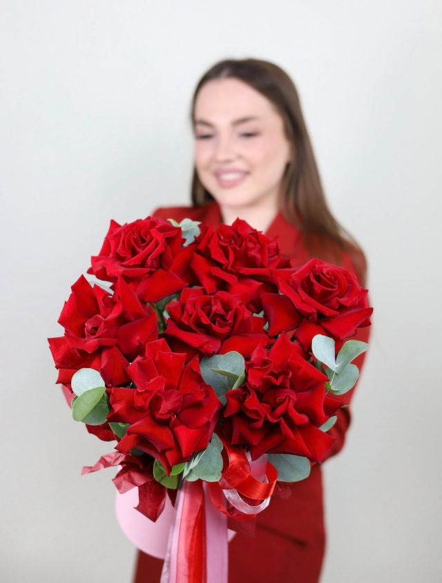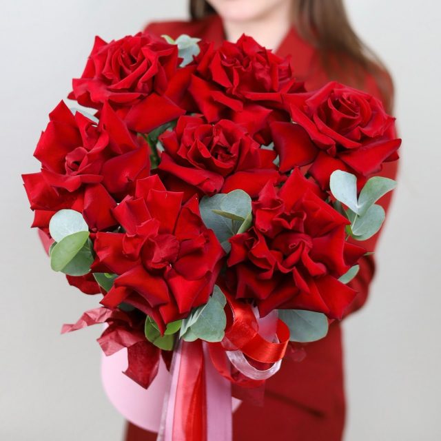 Красивая композиция из 7- ми красных французских роз с душистым эвкалиптом в шляпной коробке.