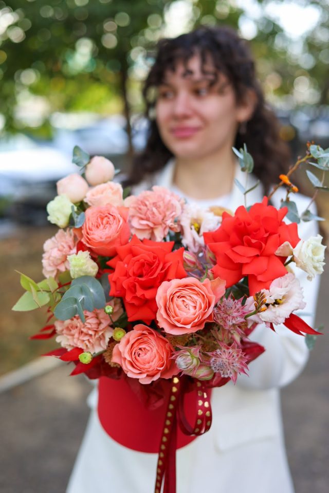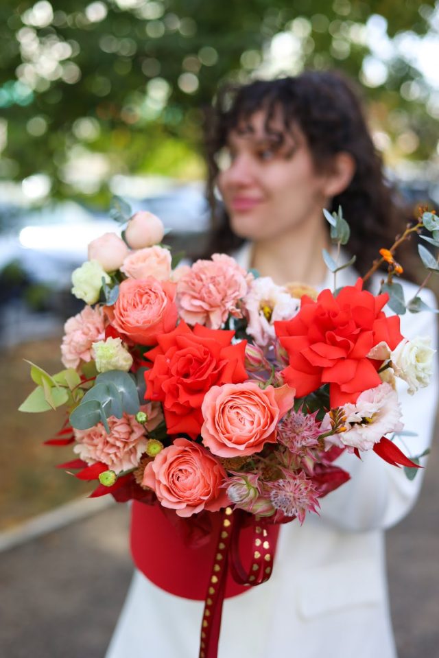 Стильная композиция в персиково-алой гамме в шляпной коробке.