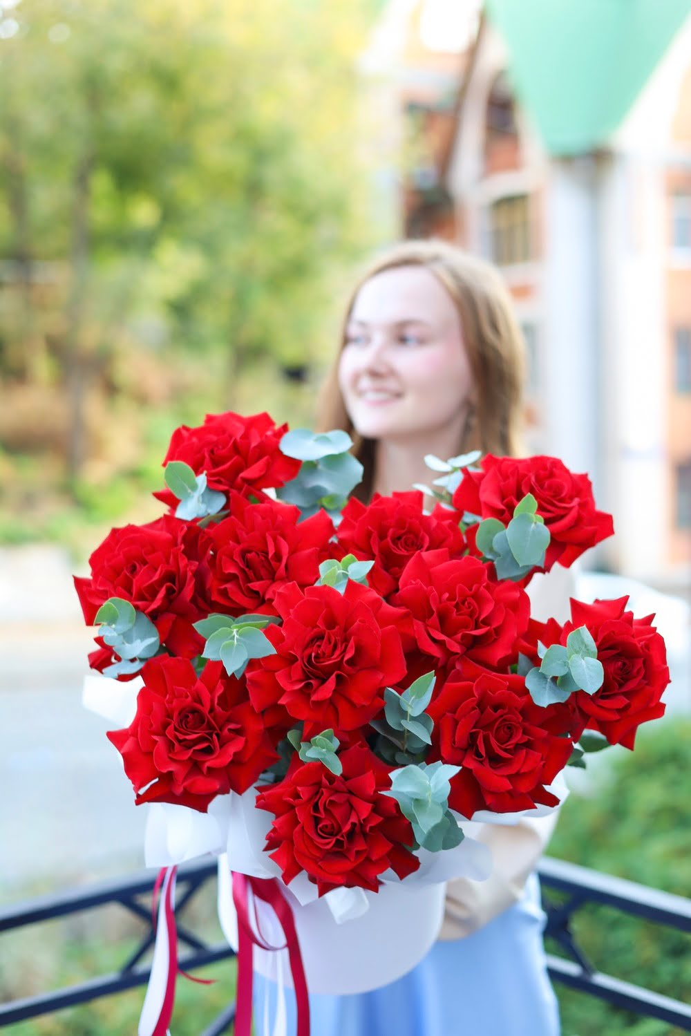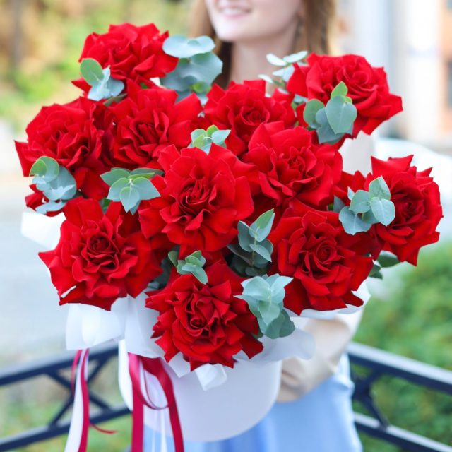 Красивая композиция из 11-ти крупных французских роз и эвкалипта.