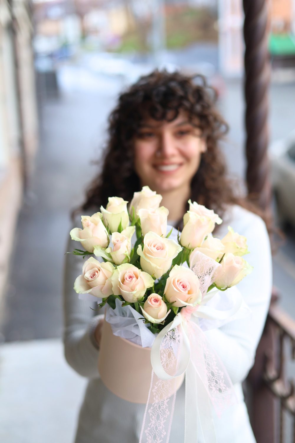 Очаровательная милая композиция из 15-ти кремовых роз в шляпной коробке.