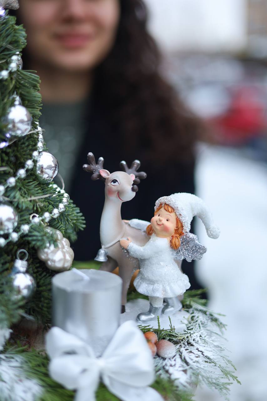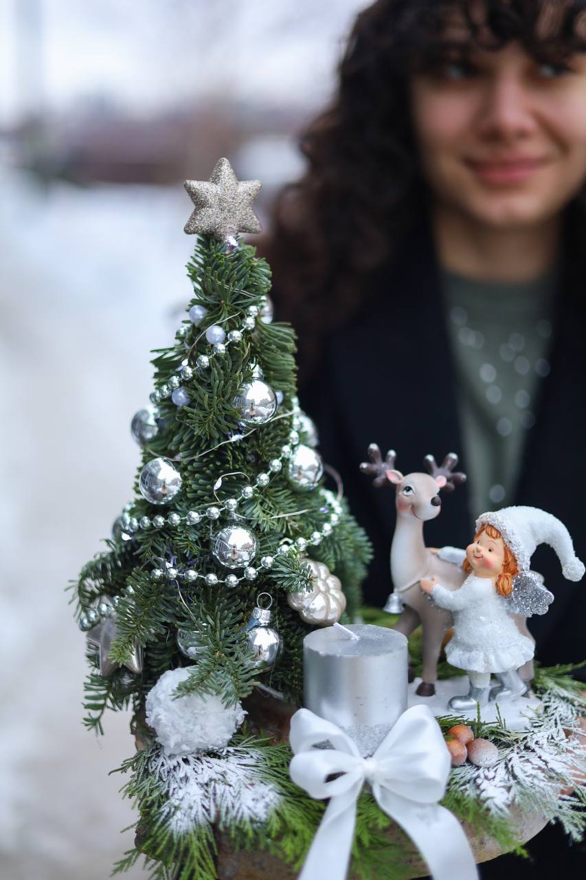 В композиции: датская ель нобилис, свеча, декоративные игрушки, туя, фигурки.
