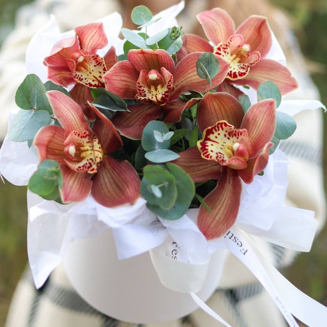 Композиция орхидей и душистого эвкалипта в шляпной коробке.