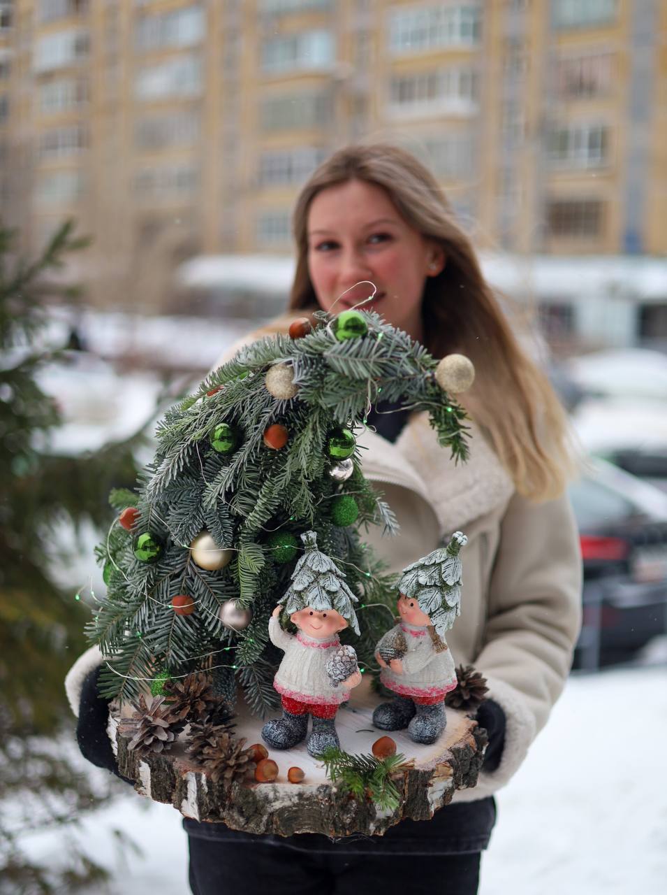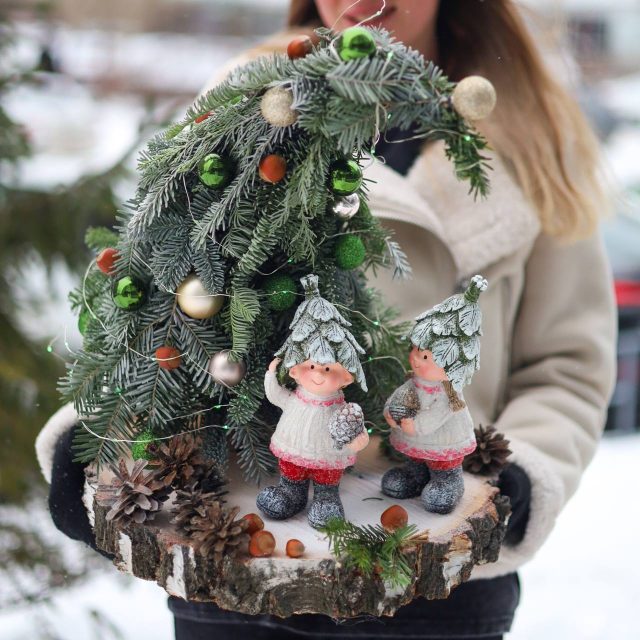 Эта композиция представляет собой сочетание нобилиса и фигурок гномов. Нобилис является основой композиции и добавляет ей свежести и приятного хвойного аромата. Фигурки гномов украшают композицию и придают ей особый шарм.