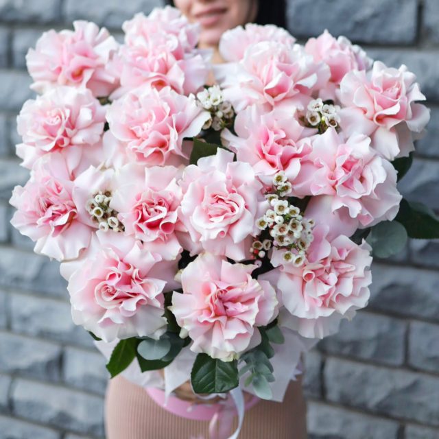 Невероятная композиция из 17-ти крупных французских роз нежно-розового цвета и душистого хамелациума в шляпной коробке.