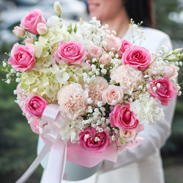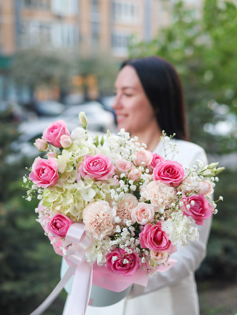 Состав: пышные гортензии, одноголовые и кустовые розы, стойкие диантусы и гипсофила.
