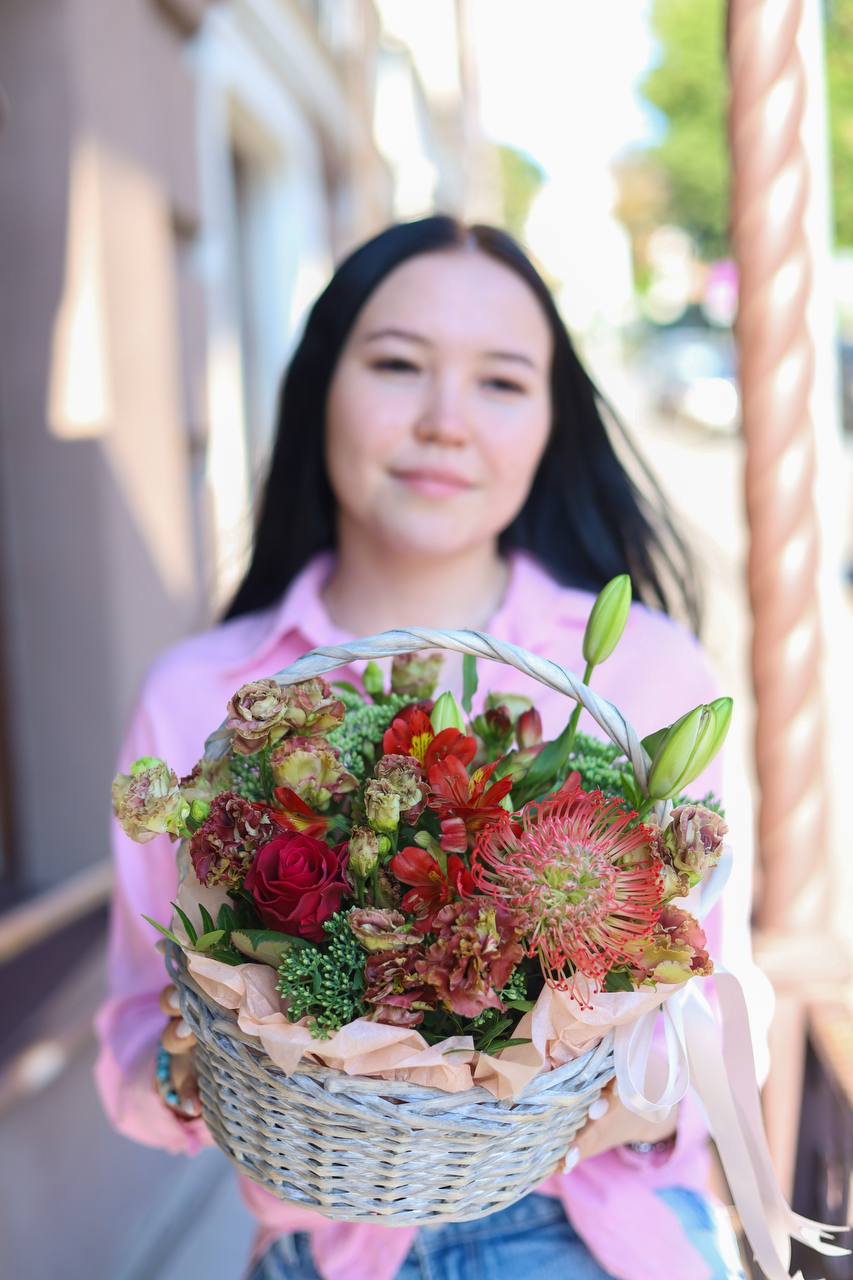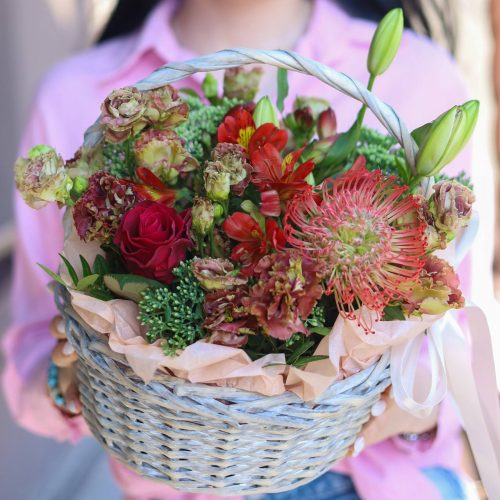 Композиция с нутаном, ажурной эустомой, лилией, розой, альстромерией и седумом в плетеной корзинке.