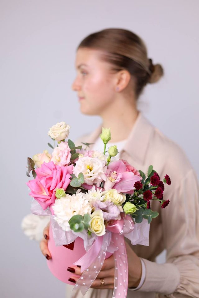 Композиция французской розы, орхидеи, эустомы, хризантемы, диантусов и зелени в шляпной коробке.