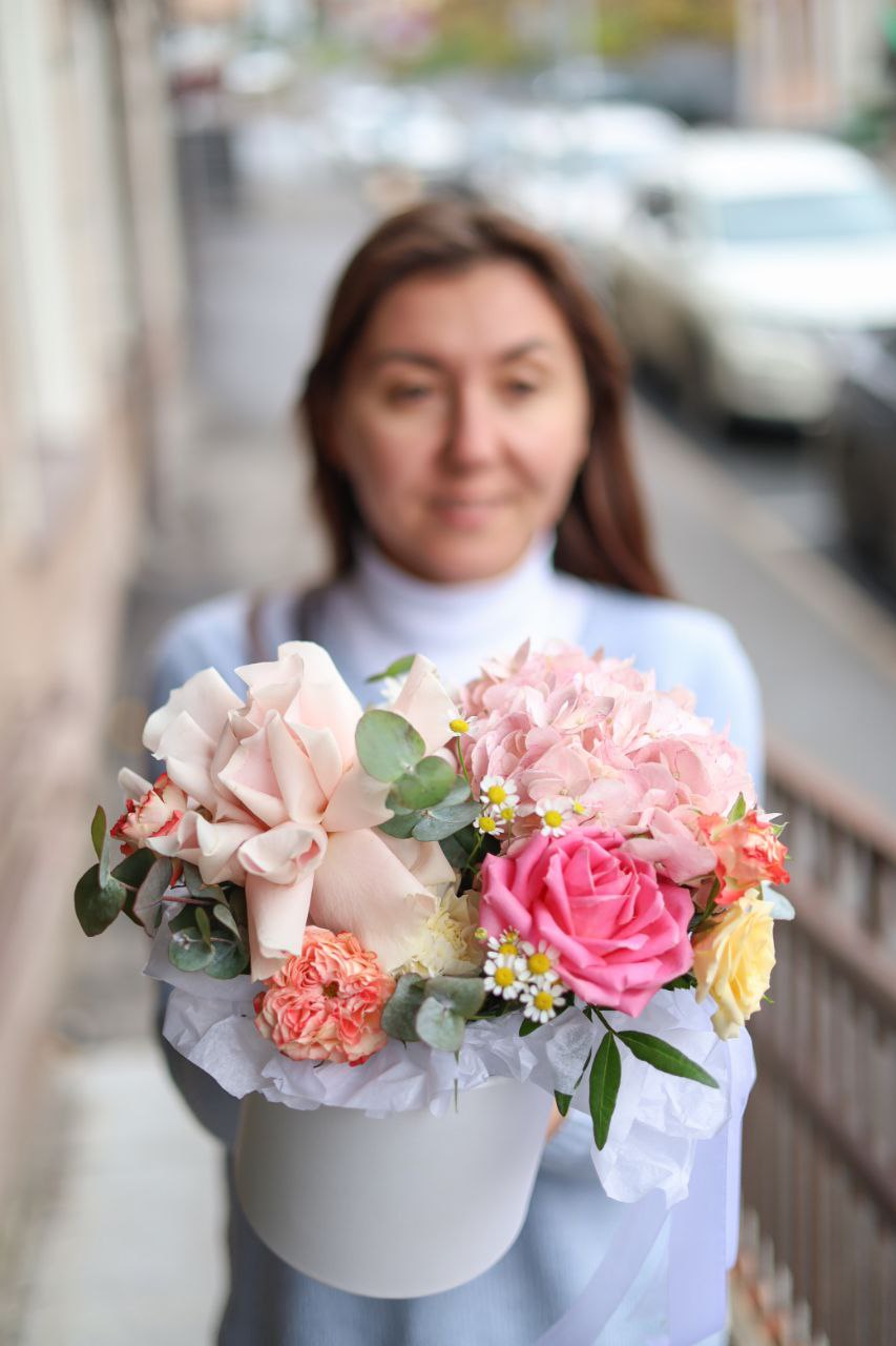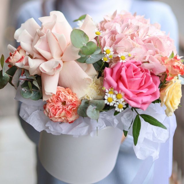 Композиция в шляпной коробке с французской розой, пышной гортензией, ароматной ромашкой и розой.