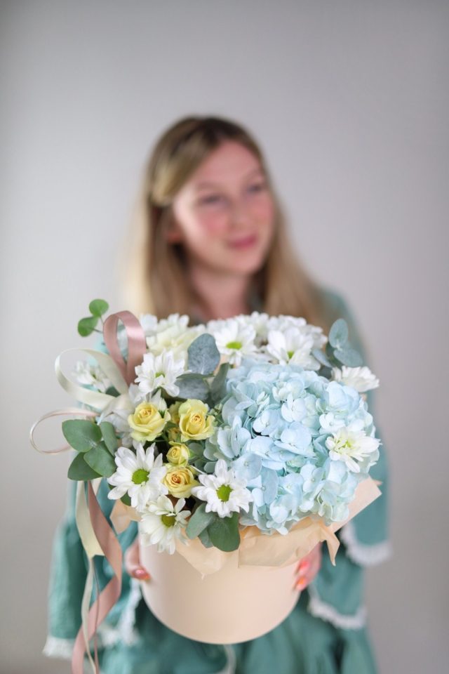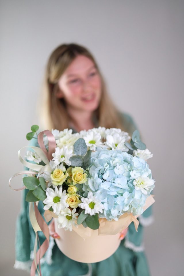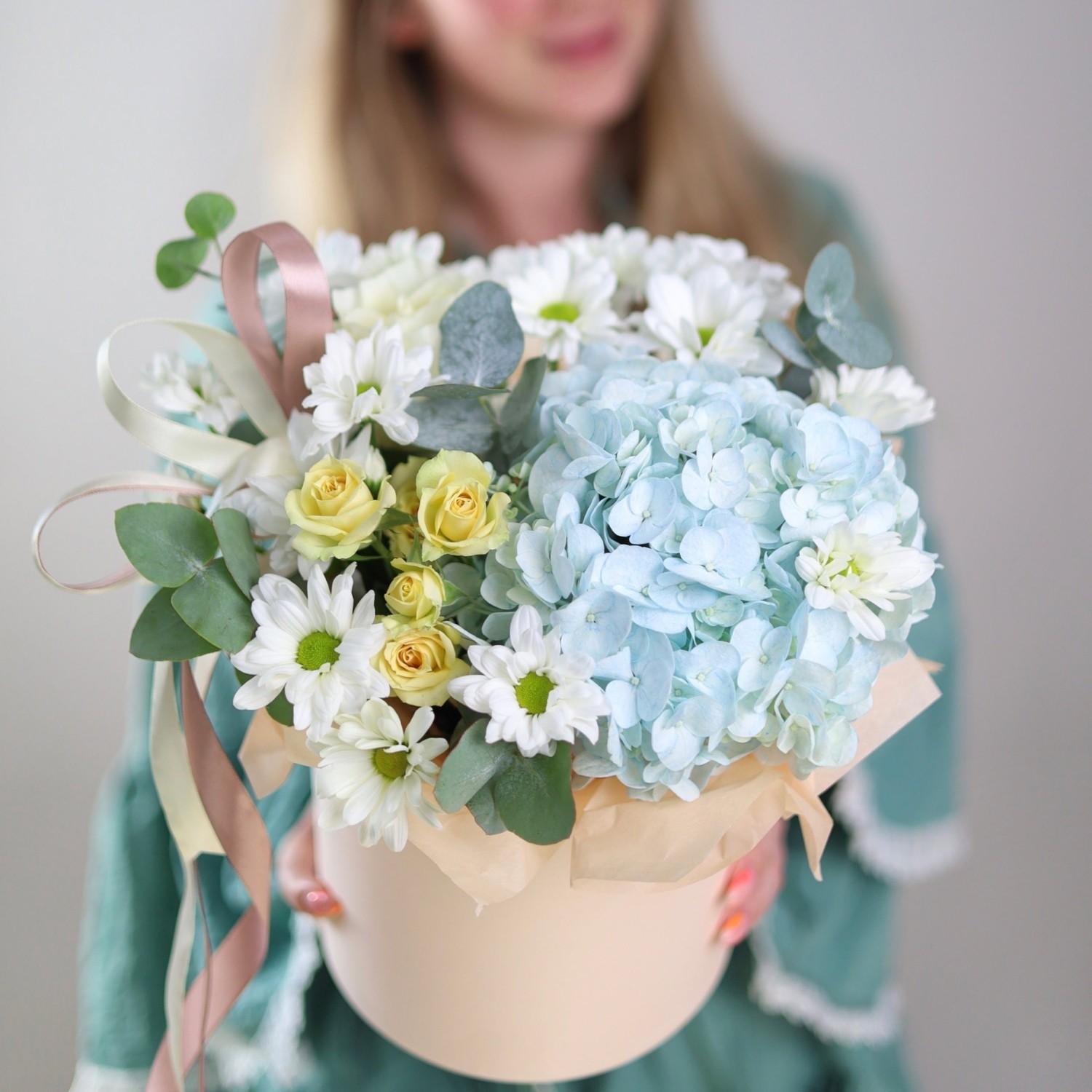 Очаровательная композиция с пышной гортензией, кустовыми розами, стойкой хризантемой и душистым эвкалиптом.