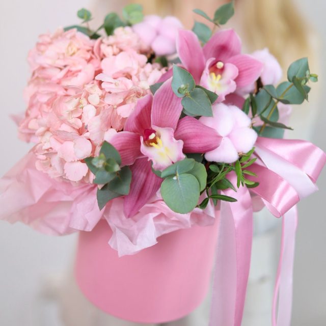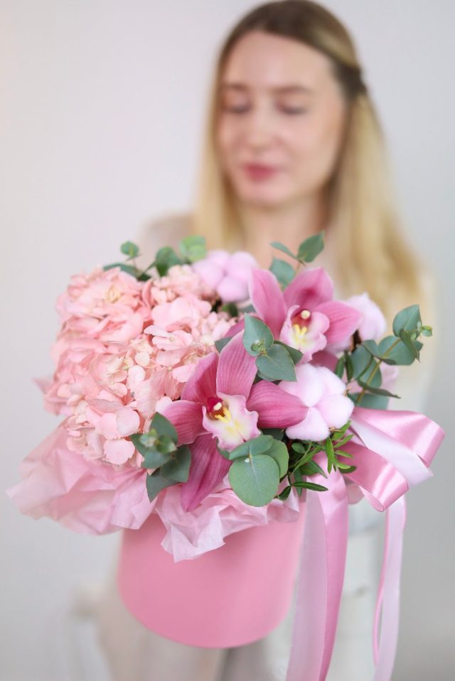 Нежная композиция в шляпной коробке с пышной гортензией, орхидеями, хлопком и эвкалиптом.