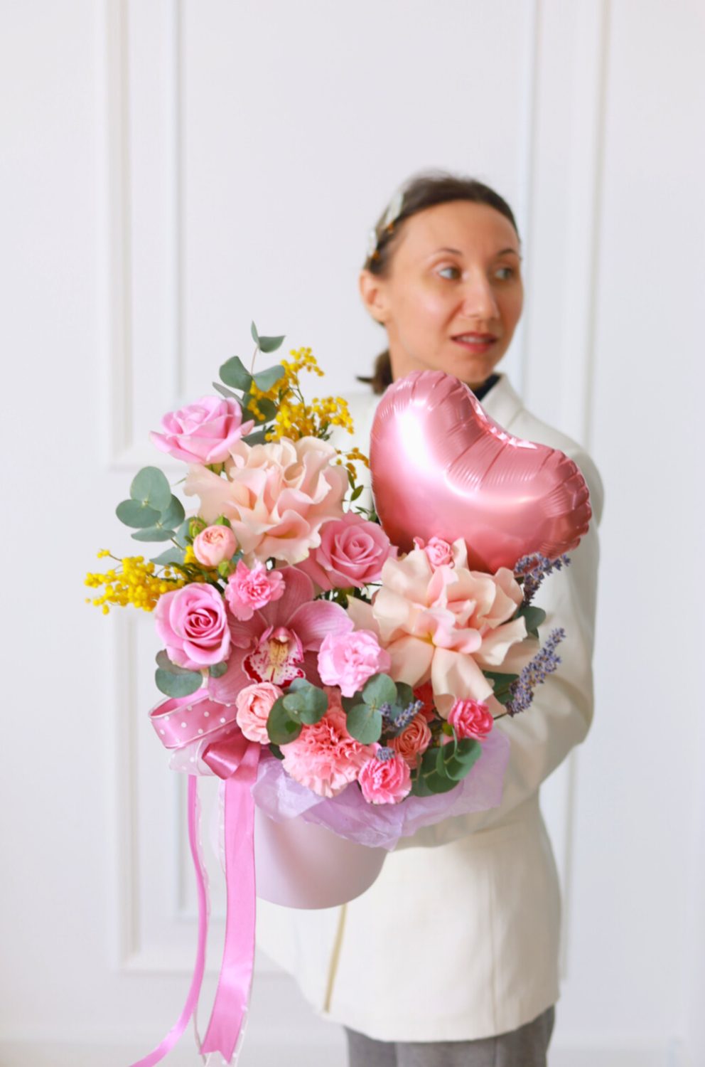 Состав: французские розы, стойкие диантусы, мимоза, кустовые и одноголовые розы, лаванда, эвкалипт, шар.
