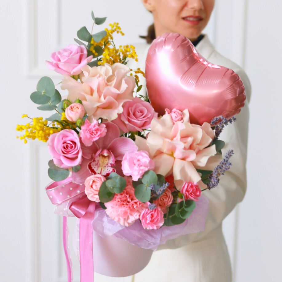 Нежная композиция в шляпной коробке с фольгированным шаром.