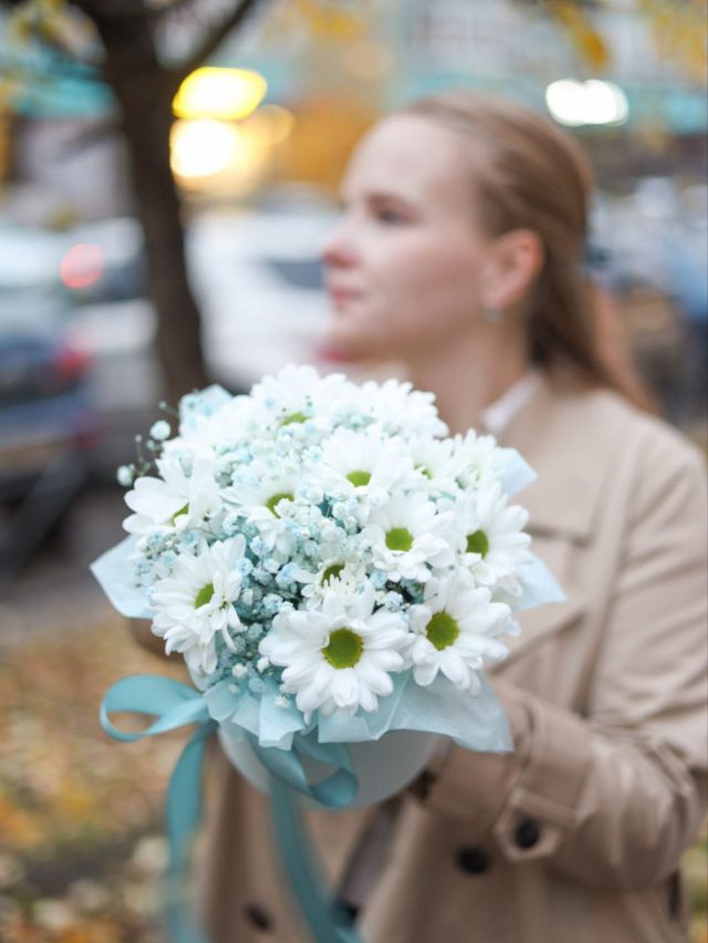 Милая композиция с хризантемой и гипсофилой в шляпной коробке.