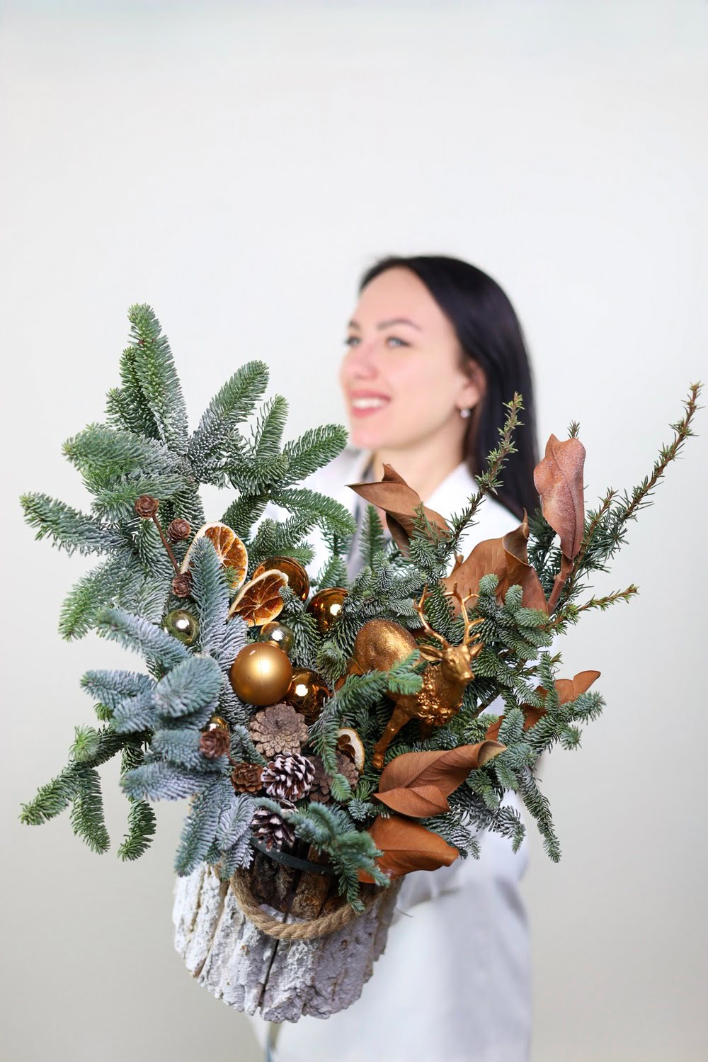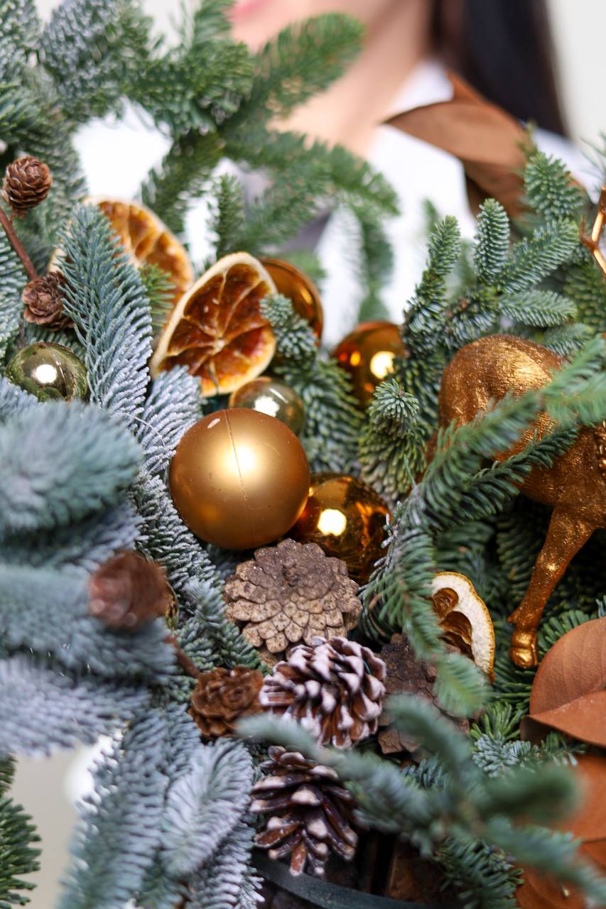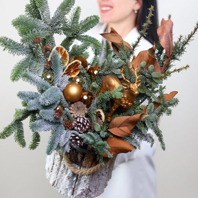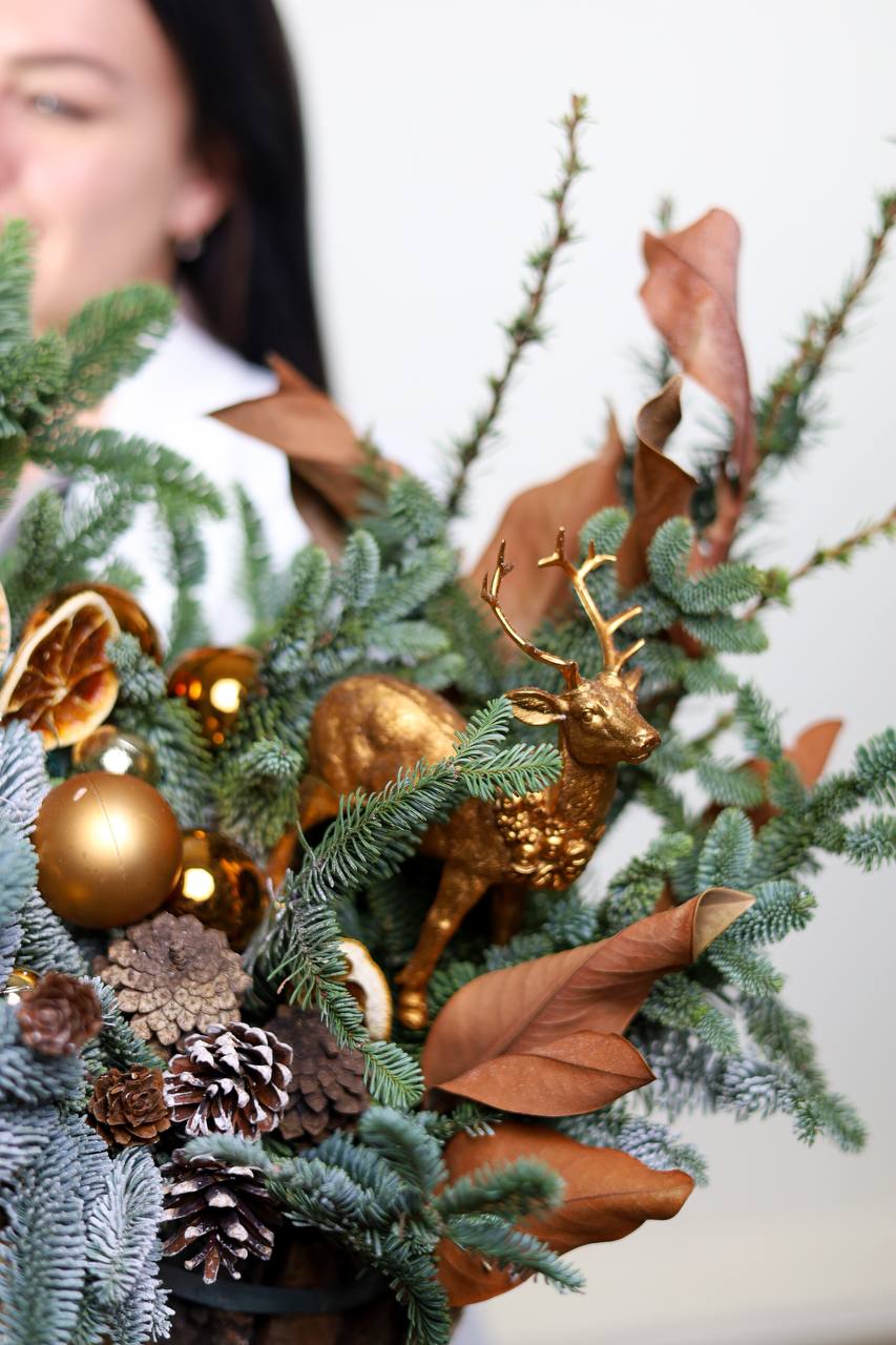 Состав: натуральный нобилис, шишки, зимний декор, листья магнолии, апельсины, фигурка “олень”. Высота около 45-50 см.
