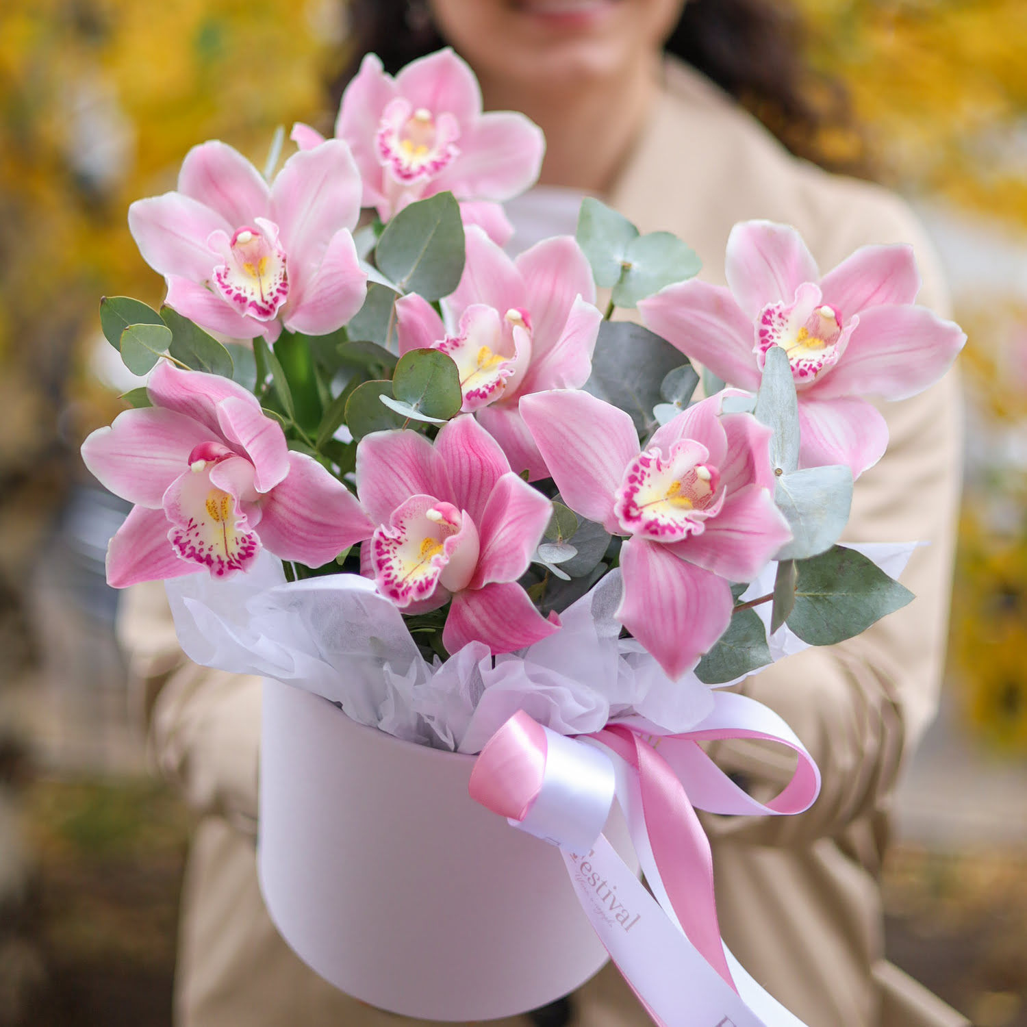 Композиция со стойкими розовыми орхидеями и эвкалиптом в шляпной коробке.