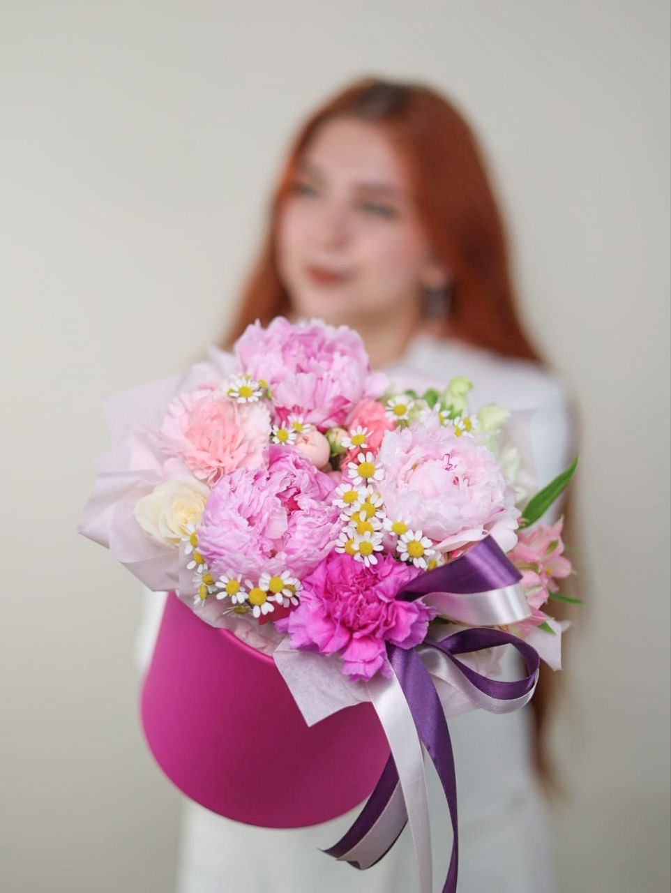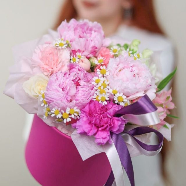 Композиция с пионом, стойким диантусом и ароматной ромашкой в шляпной коробке.