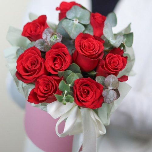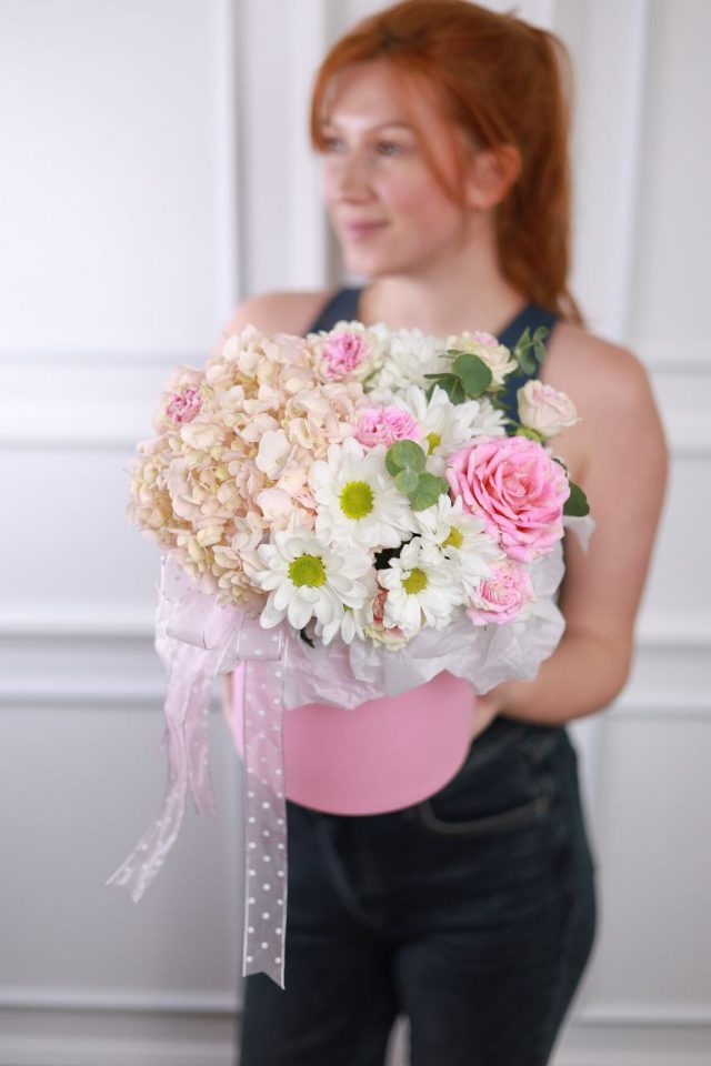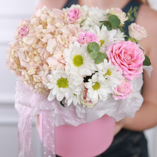 Композиция с пышной гортензией, хризантемой, розой и эвкалиптом в шляпной коробке.