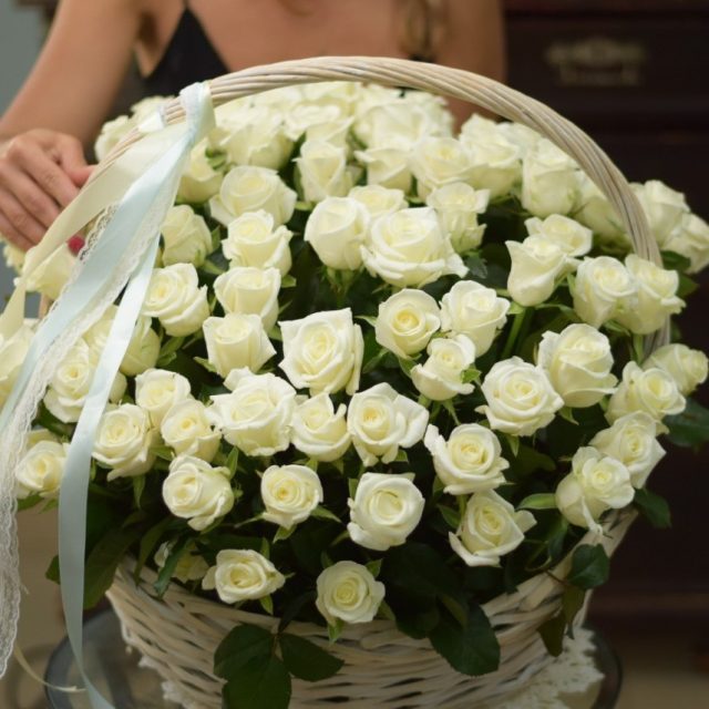 Большая корзина белых роз (101).