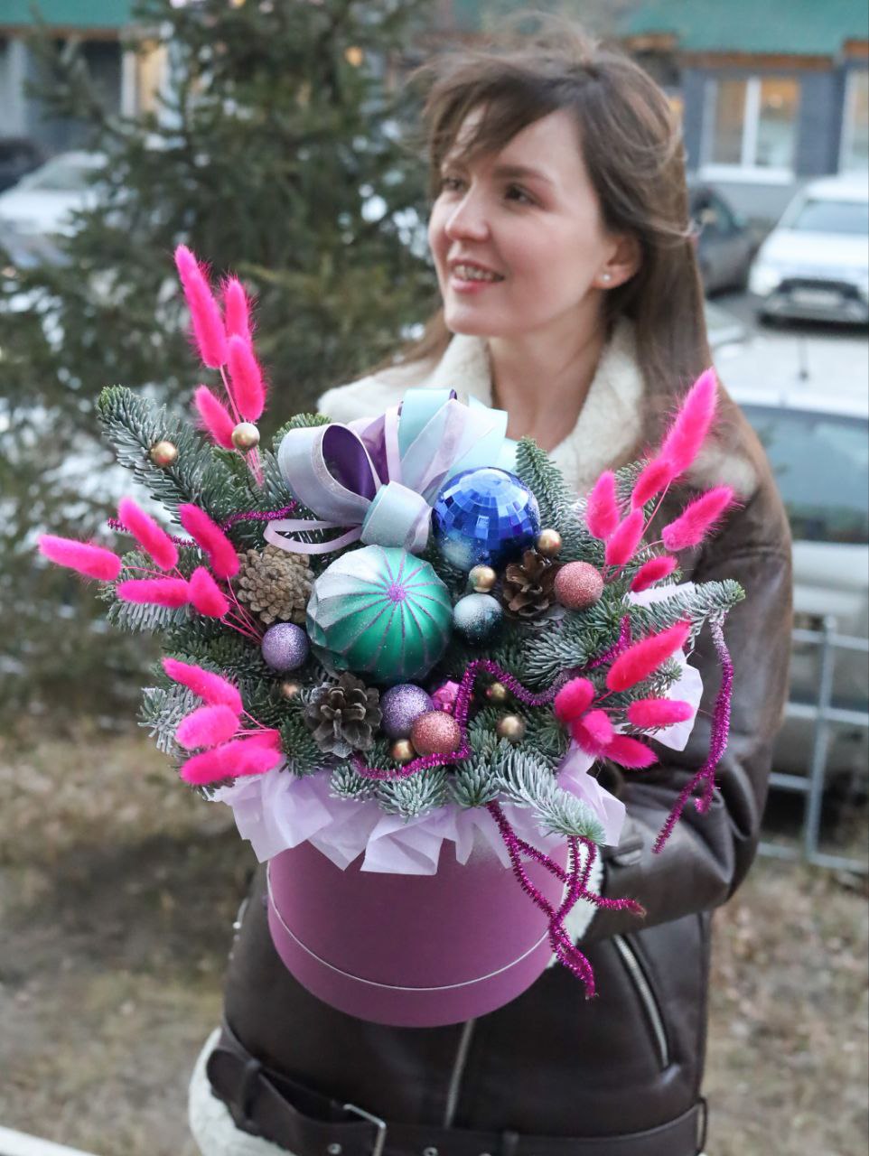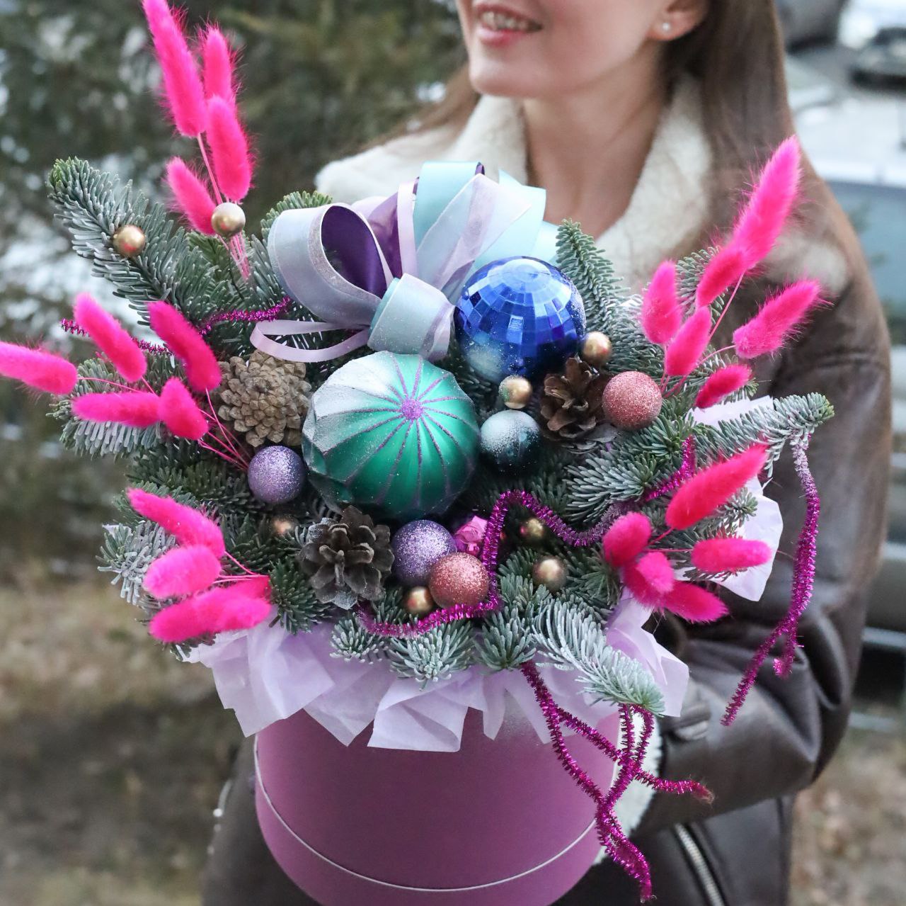 Композиция с датской елью, натуральными шишками, новогодними игрушками и лагурусом в шляпной коробке.