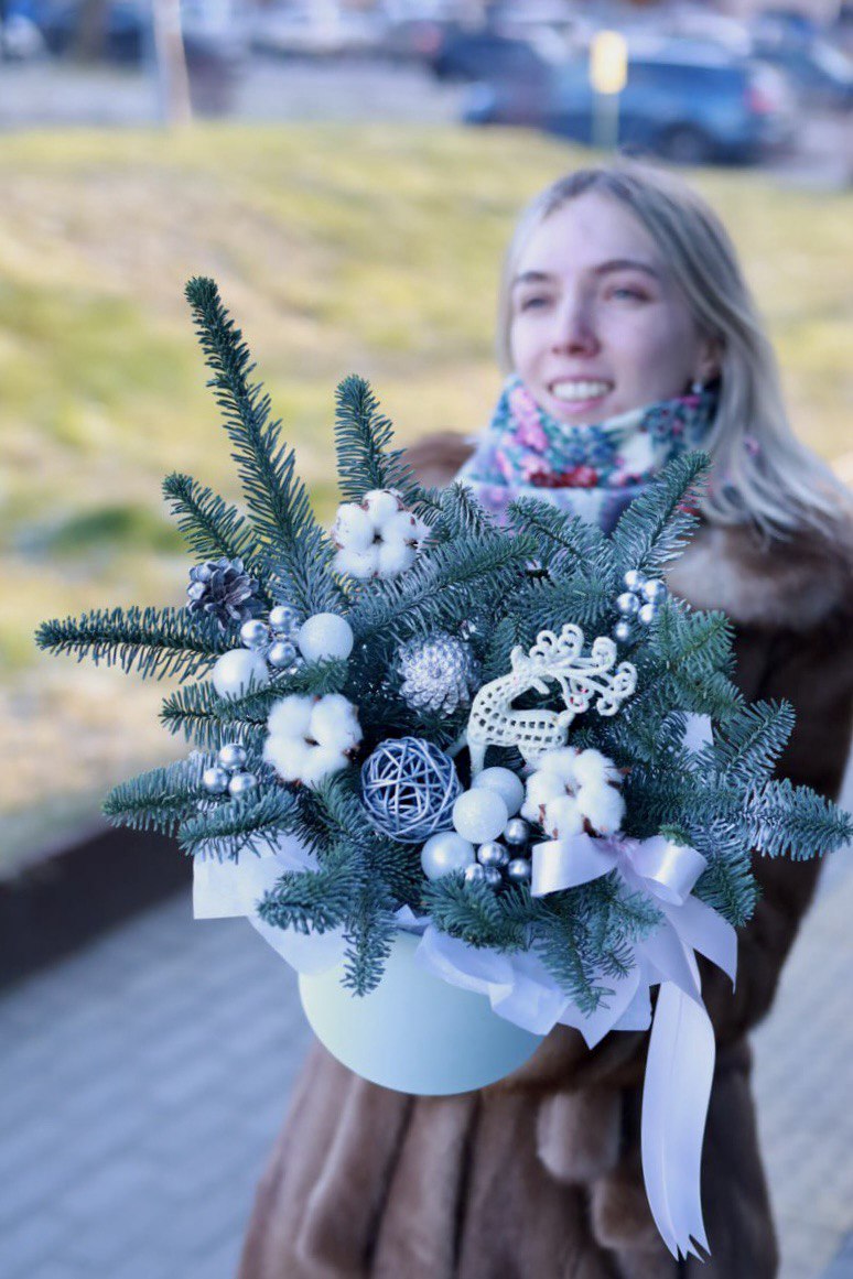 Очаровательная зимняя композиция в бело-серебристой гамме в шляпной коробке.