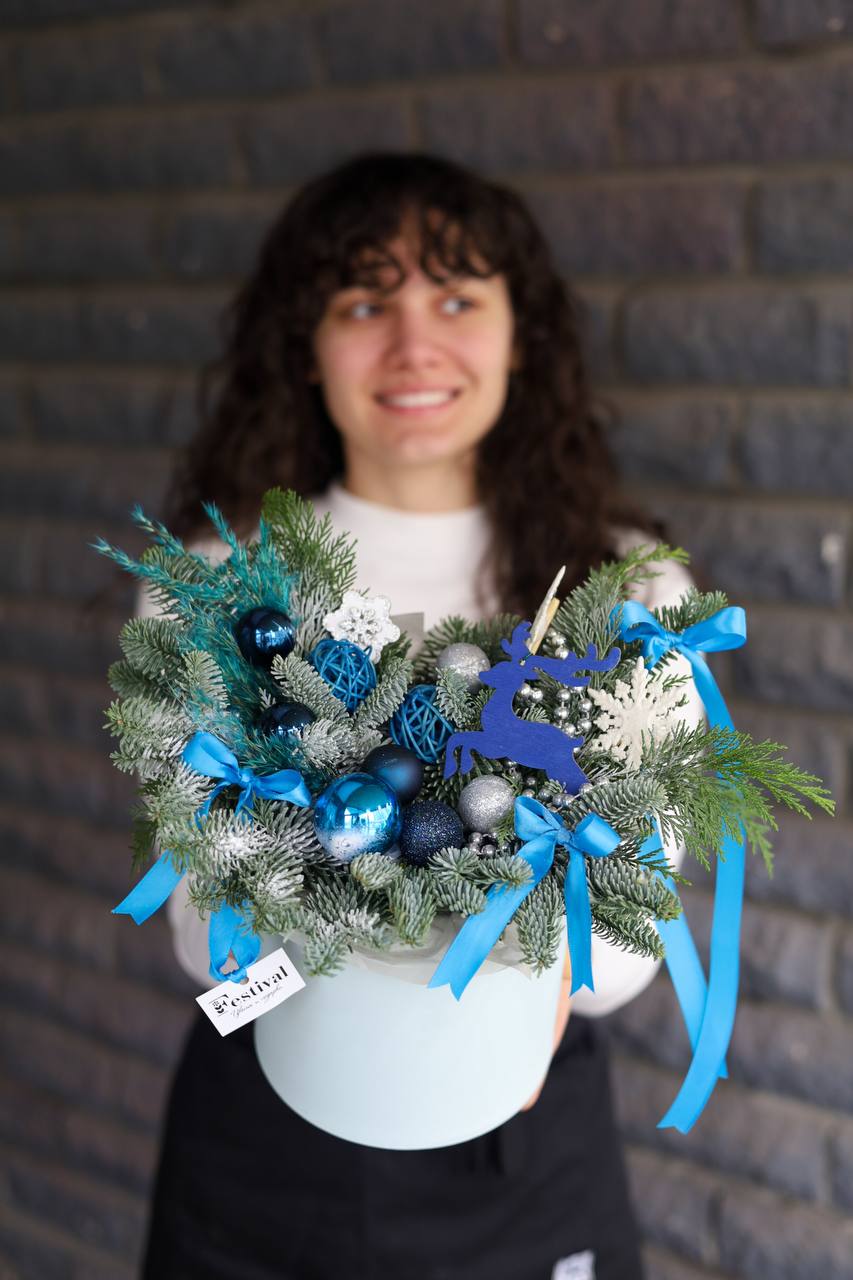 Очаровательная зимняя композиция в насыщенных голубых оттенках в шляпной коробке.