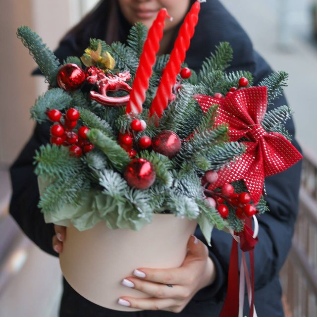 Композиция нобилиса, декоративных игрушек и свечей в шляпной коробке.