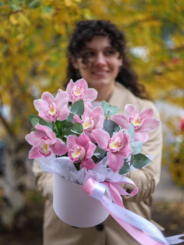 Композиция орхидей и эвкалипта в шляпной коробке.