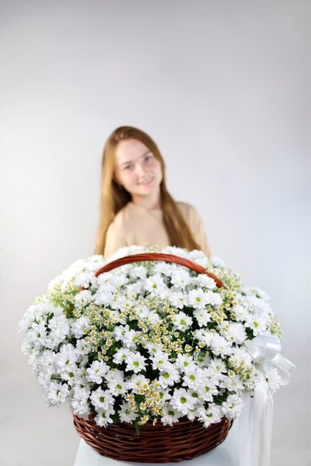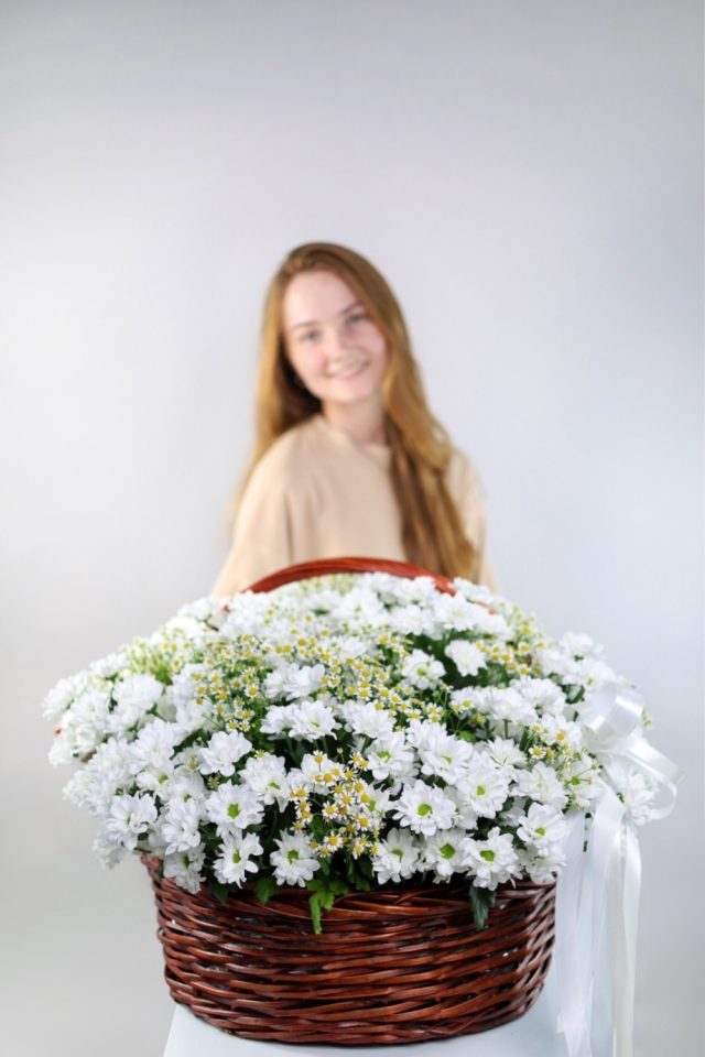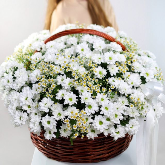 Великолепная композиция из кустовых ромашковидных хризантем и ароматных ромашек в плетеной корзине.