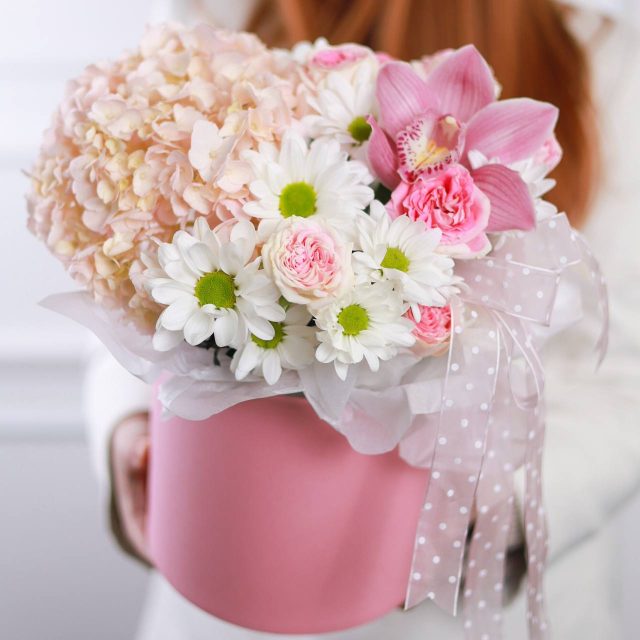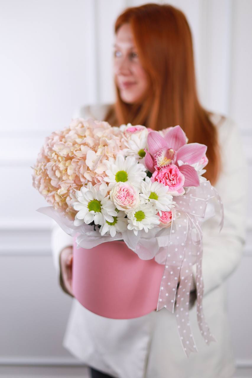 Композиция пышной гортензии, орхидеи, хризантемы и кустовых роз в шляпной коробке.