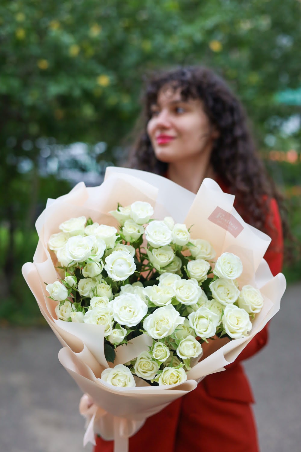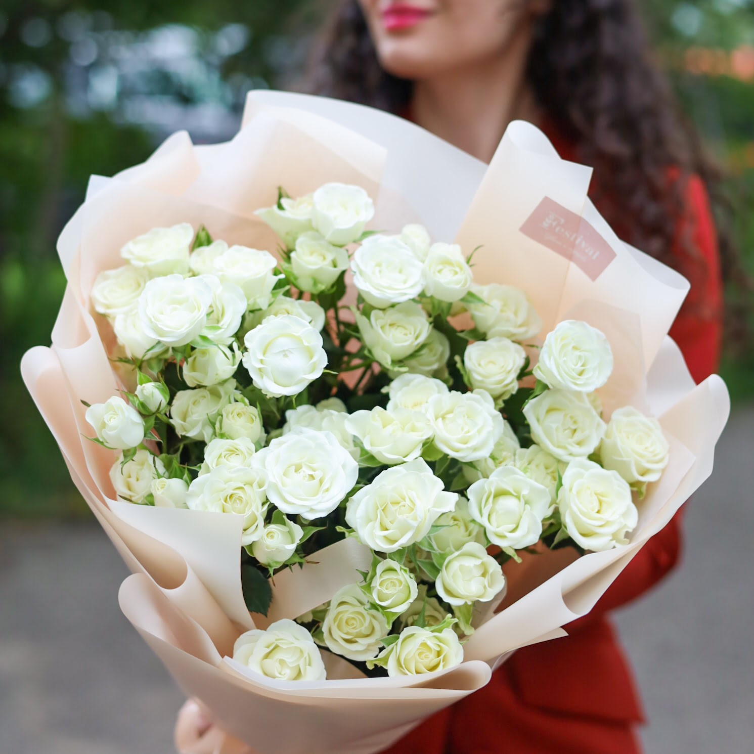 Красивый и очень нежный букет белой кустовой розы в оформлении.
